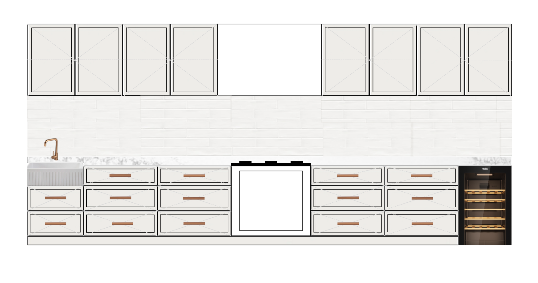 create a clean architectural kitchen elevation rendering based on the provided drawing maintain the exact cabinet layout proportions and alignment from the elevation do not change geometry cabinet sizes appliance locations or layout the image must remain a flat 2d orthographic elevation view important requirements keep the view perfectly front on no perspective no 3d angle maintain a technical elevation style cabinetry upper and lower cabinetry finished in soft grey shaker style doors with subtle recessed panel detailing drawer fronts include slim brushed brass bar handles benchtop light grey marble look stone benchtop with subtle veining splashback light grey marble look stone benchtop with subtle veining sink and tapware flutted or ribbed apron front farmhouse sink with brushed brass gooseneck tap appliances black and glass centered cooktop below the integrated rangehood built in wine fridge on the right side with glass door and timber shelving rendering style clean architectural elevation style flat orthographic view even studio lighting subtle material realism minimal shadows professional kitchen joinery drawing presentation render quality ultra clean linework high resolution architectural presentation quality soft material textures no perspective distortion important remove construction lines x marks in cabinet panels but retain all cabinetry and appliance placement exactly as shown keep the image strictly as a 2d elevation drawing with realistic materials applied