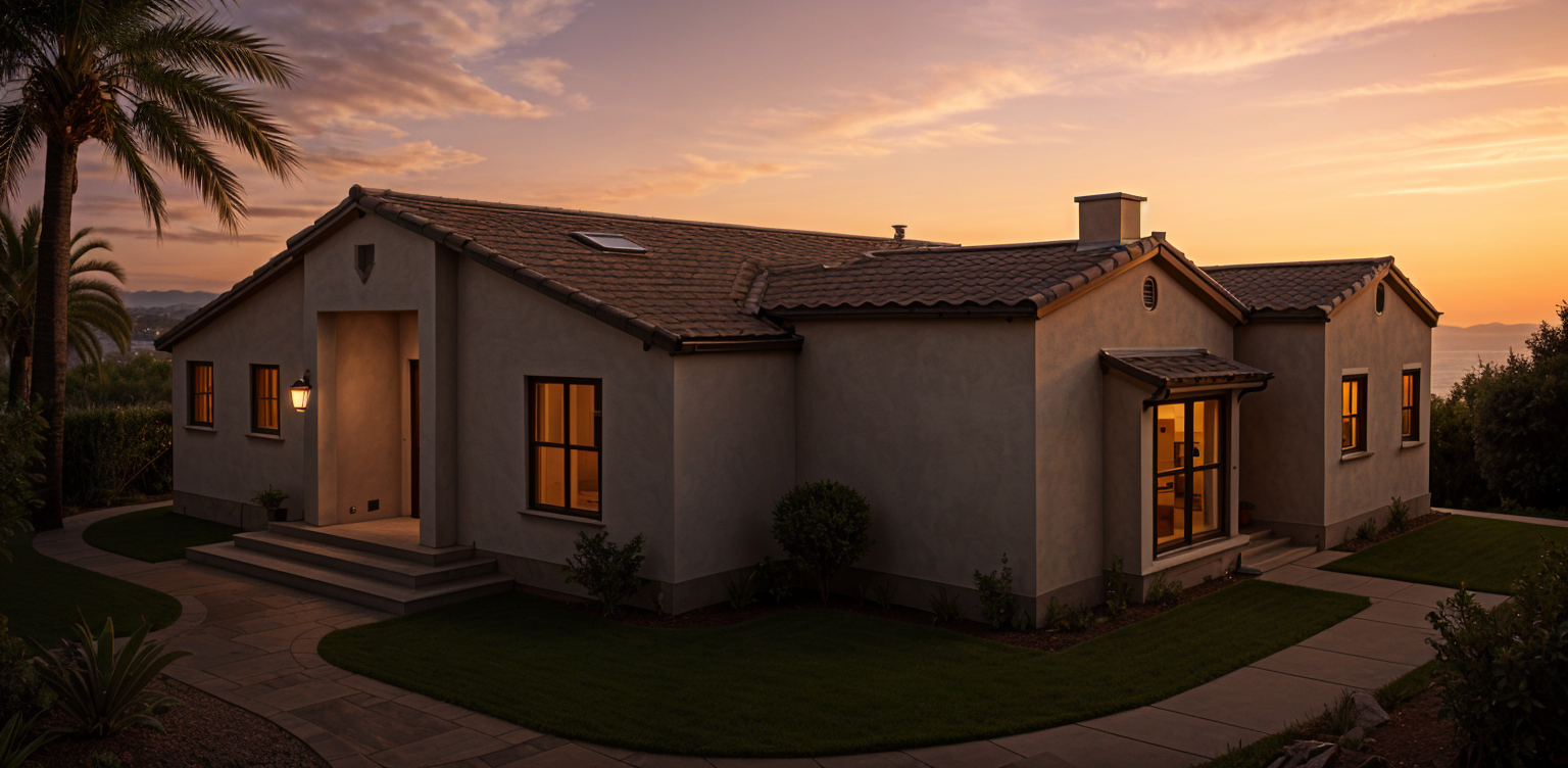 modern spanish style santa barbara sunset ocean view tropical vegetation impressionist watercolor