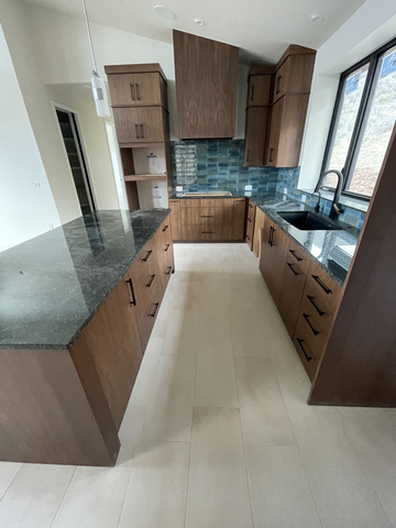 do not change the cabinets in any way preserve the exact cabinet colors materials finishes dimensions door and drawer styles hardware spacing alignment and all geometry exactly as shown do not alter the countertop shape backsplash appliances flooring lighting fixtures or wall structure only remove the construction materials clutter and mess from the scene clean the room and make it look finished and staged add a few simple tasteful home accessories appropriate for the style of the space but do not add or remove any furniture windows or architectural elements maintain the original lighting direction and realism enhance clarity and polish the photo while keeping the cabinetry and room design completely unchanged do not alter the lighting to keep the cabinet colors as they are in the image keep perspective as is turn the lights on put double ovens in the full height cabinet to the left of the hood stage as an entertaining modern kitchen