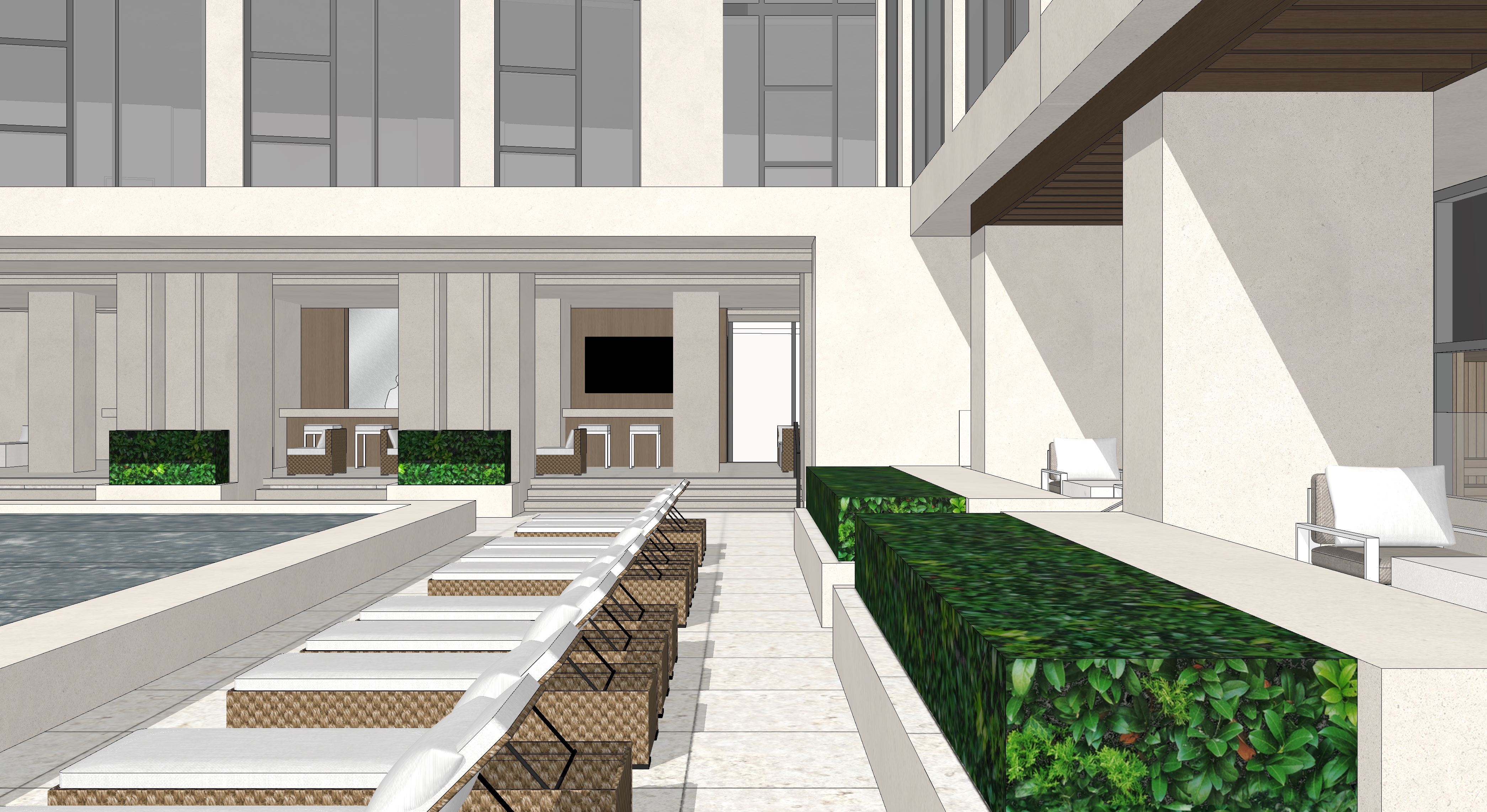 render a luxurious rooftop pool area with a modern minimalist design the pool water should be a rich azure blue reflecting the sky surround the pool with sleek white stone tiles arrange elegant loungers with rattan bases and soft white cushions symmetrically along the poolside incorporate neatyl clipped hiedges in planters for a touch of nature the building facade should have a smooth light beige finish with tall elegant glass windows the atmosphere should be serene and upscale capturing a sunny day with soft shadows for a sophisticated look