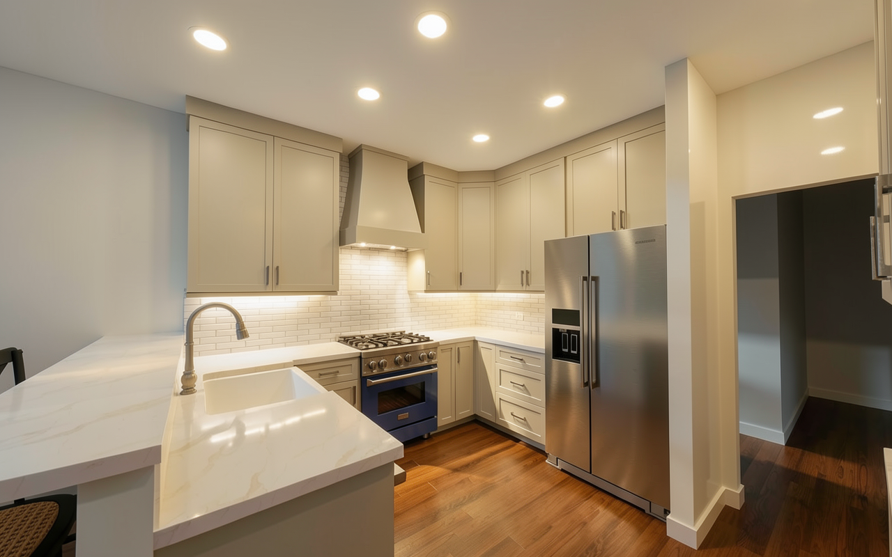 add an led strip vertically into open bookcase module to the left of the fireplace add a abstract painting to the wall above the fireplace add an led strip only on the top of the cabinets on either side of the fireplace