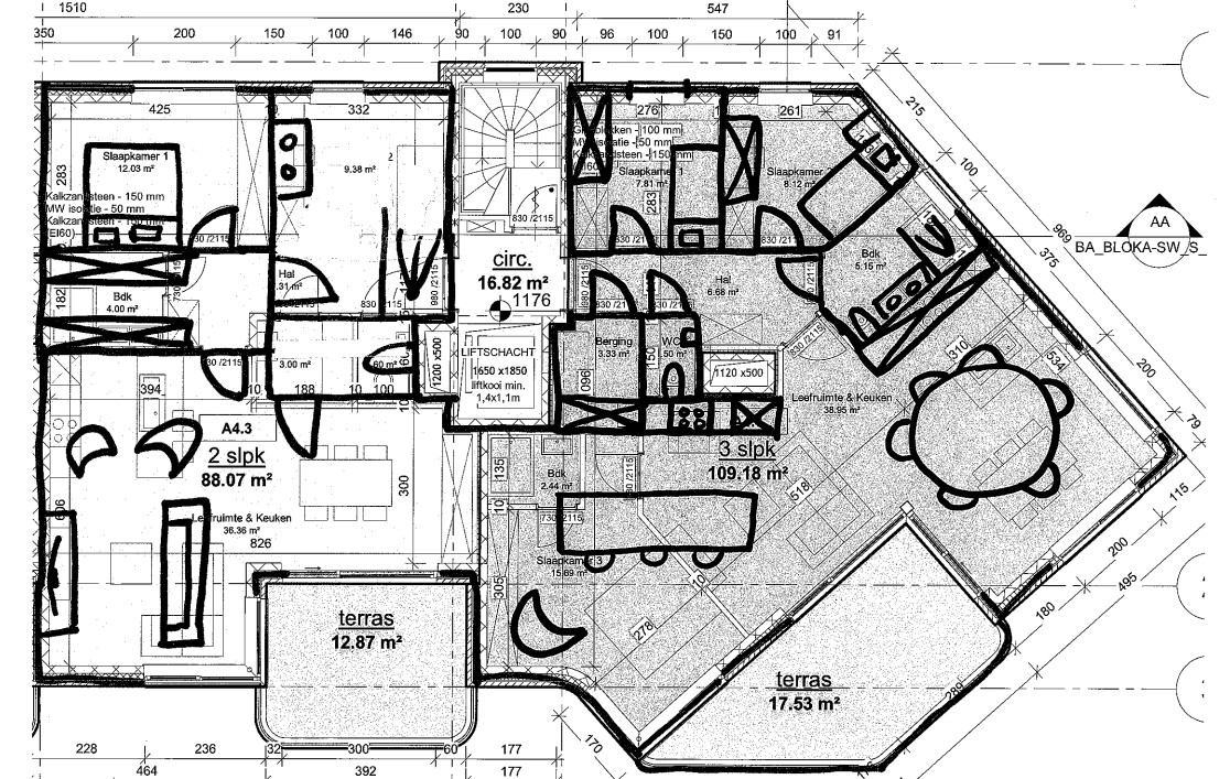 action image generation action input a professional clean and high quality 2d architectural floor plan based on the provided sketch the drawing should be in a minimalist cad style with sharp black lines on a clean white background it must accurately represent the layout of the two apartments apartment a4 3 2 bedrooms 88 07 m on the left and the larger 3 bedroom apartment 109 18 m on the right include the central circulation area with the elevator shaft liftschacht the balconies terras and the internal room divisions for bedrooms slaapkamer bathrooms bdk badk and living kitchen areas leefruimte keuken maintain all proportions door swings and window placements exactly as shown in the original document using professional architectural symbols and clear typography for labels
