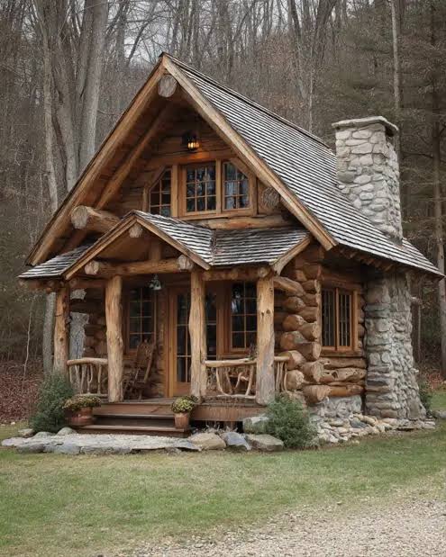 create a high res real photo with spring setting green grass colorful bushes and plants with blue sky add 4 adirondack chairs around the fire pit off to side of home looking at lake show board batten siding with reclaimed wood grey color on all woods show a lake scene behind the house show driveway to cabin 16 9 ratio no long siding or post