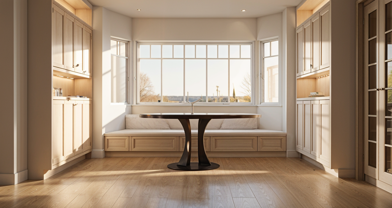 no outdoor furniture the sun behind a trees sunlight beams through the branches casting soft rays and subtle highlights from the right realistic no tree shadow on facade and detailed facade textures and a vibrant clear sky with light atmospheric depth render in hyper realistic architectural visualization quality 8k resolution