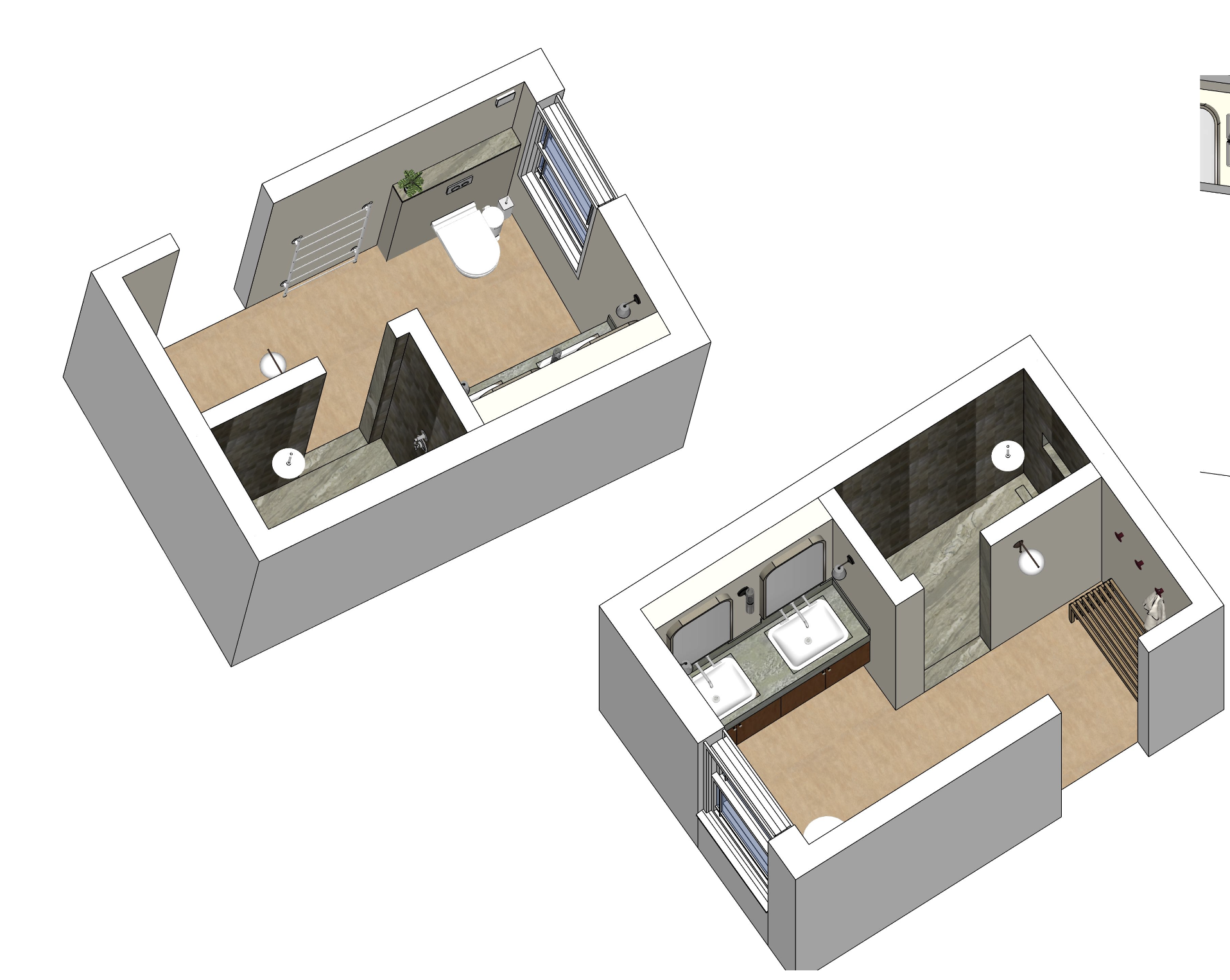 interior shot create a stunning isometric rendering of a modern luxurious bathroom interior the walls are painted a soft cream color lending a warm and inviting atmosphere the floors are finished in a textured porcelain large tile in an earthy light terracotta finish adding a touch of elegance and natural warmth the shower floor and vanity unit feature a subtly veined pistachio green marble the shower walls are covered in glossy ceramic tiles in a sage green colour the toilet is minimalist porcelain sleek and white complemented by brushed nickel tap ware there is a green potted plant on the cistern shelf adding a hint of nature window has a relaxed sheer linen blind in a cream allowing natural light to flood the room creating a serene and peaceful ambiance the overall mood is calm sophisticated and spa like with a focus on clean lines and understated luxury