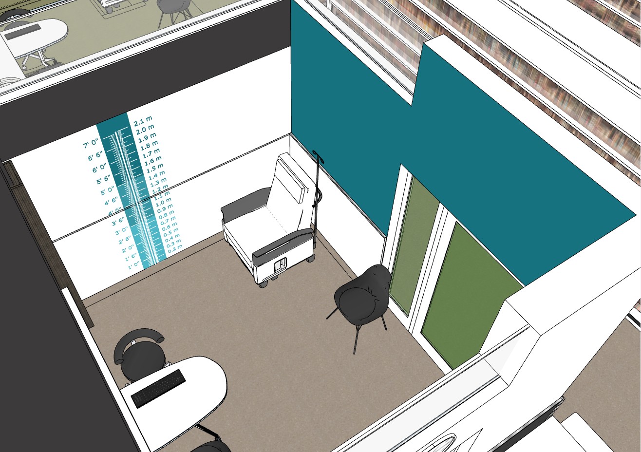 add a curved mural graphic on the teal wall using only blue tones as shown in the height chart below is an example of the curved graphic please ensure the colors remain within the blue palette and do not include any rainbow hues