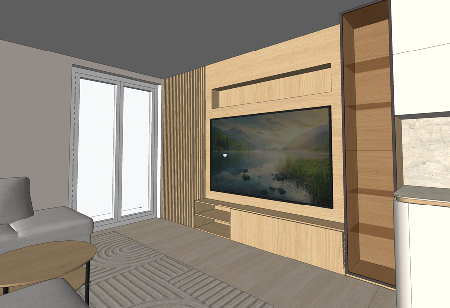 render a photorealistic interior visualization keep the materials and furniture layout exactly as shown in the image add little bit of minimalistic decorations add led lighting under the upper cabinets add an led strip in the niche above the tv