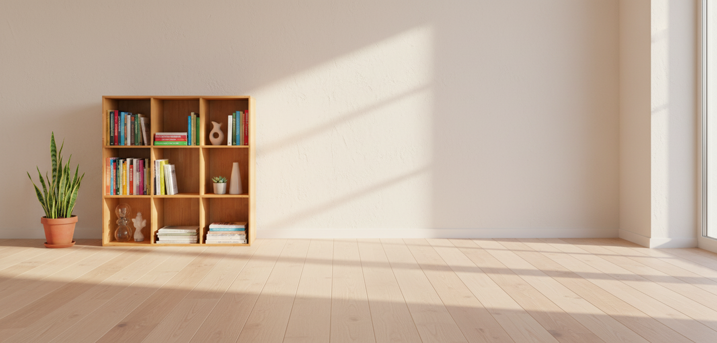 modernist exterior shot replace the plain background with a warm cozy modern scandinavian living room setting that complements the natural light wood tone of the bookshelf replace the plain background with a warm cozy modern scandinavian living room setting that complements the natural light wood tone of the bookshelf keep the bookshelf exactly as it is do not alter its design proportions angle perspective wood grain or color maintain realistic lighting and shadows consistent with the original object position the bookshelf on the left side of the composition occupying about 1 3 of the frame leave the right side mostly empty with a clean softly textured wall warm off white or light beige plaster finish to create spacious negative space lighting should be soft natural daylight coming from the right side casting gentle shadows and enhancing the wood texture use light wood or neutral matte flooring for a cohesive minimal look keep decoration minimal and subtle optionally include a small potted plant besides the bookshelf put some books on the bookshelf architecture