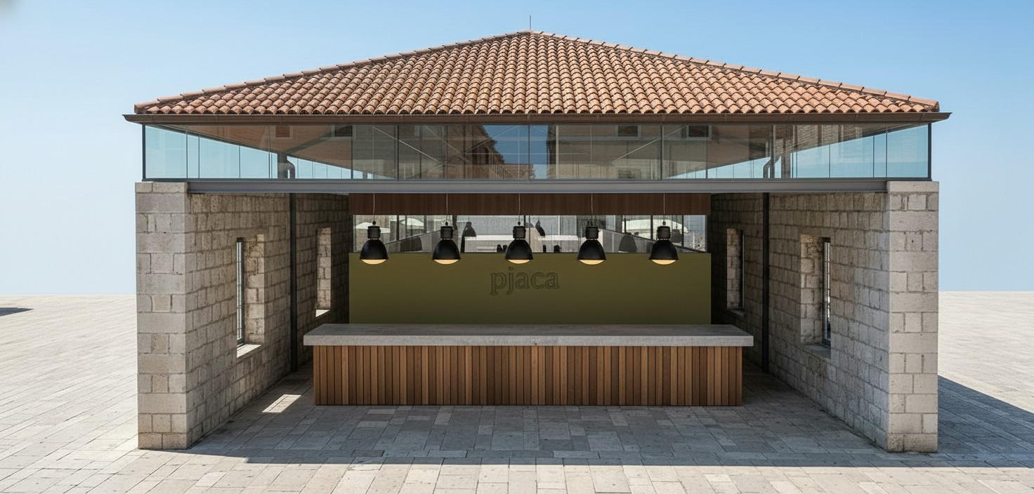 depict a serene picturesque outdoor market with a classic design light gray stone walls and a terracotta tile roof with warm earthy tones include large translucent windows that allow natural light to flood the space the counter has a wood texture with a soft walnut color elegant black lamps hang overhead casting a soft ambient light a muted olive green backdrop adds subtle contrast the atmosphere is calm inviting and sunny set in a spacious square with light gray stone paving to the right of the building is the road and then the sea and to the left is the bar terrace