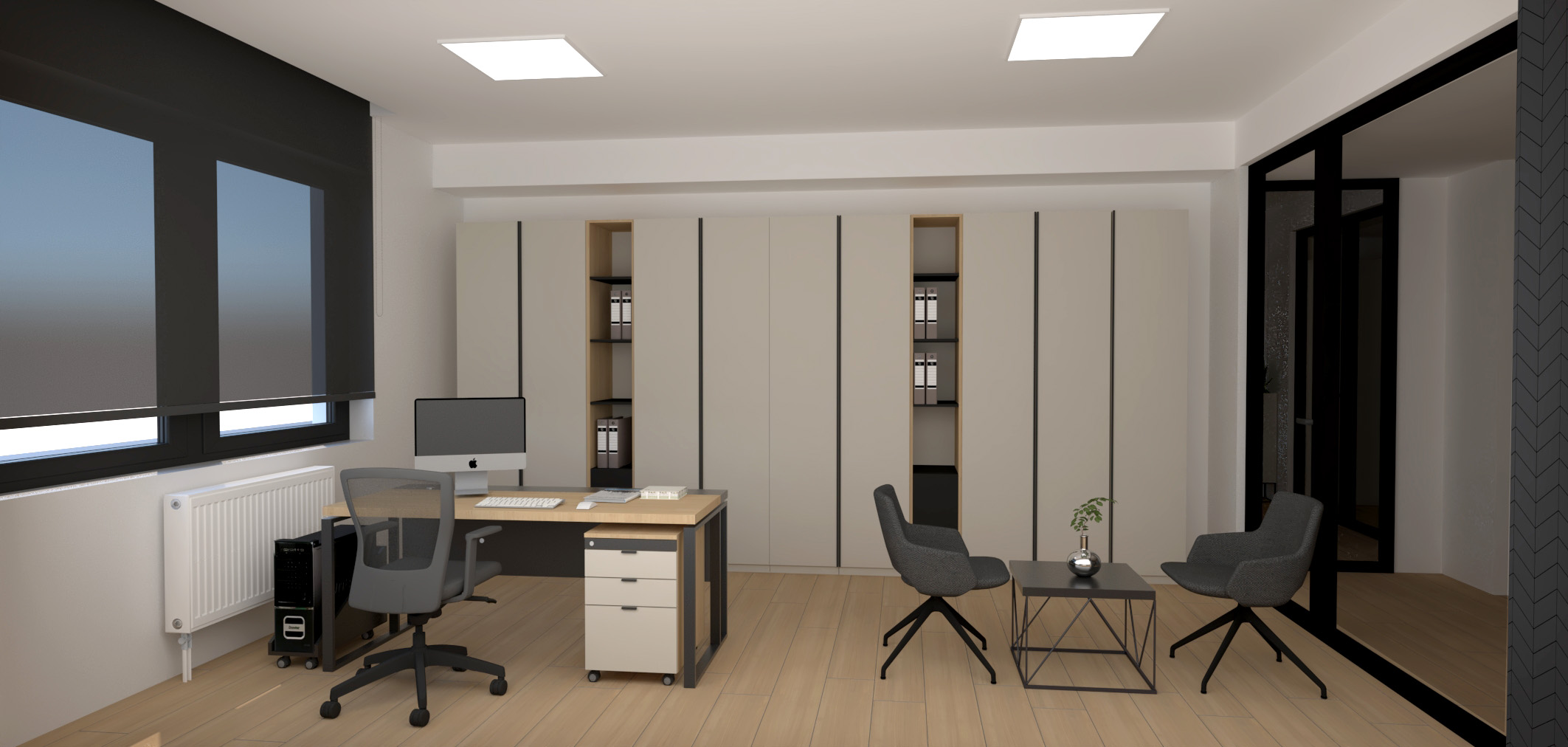 improve the image make it photo realistic create an office effect do not add any new details to the image put glass on portals with black frames on the right side of the picture