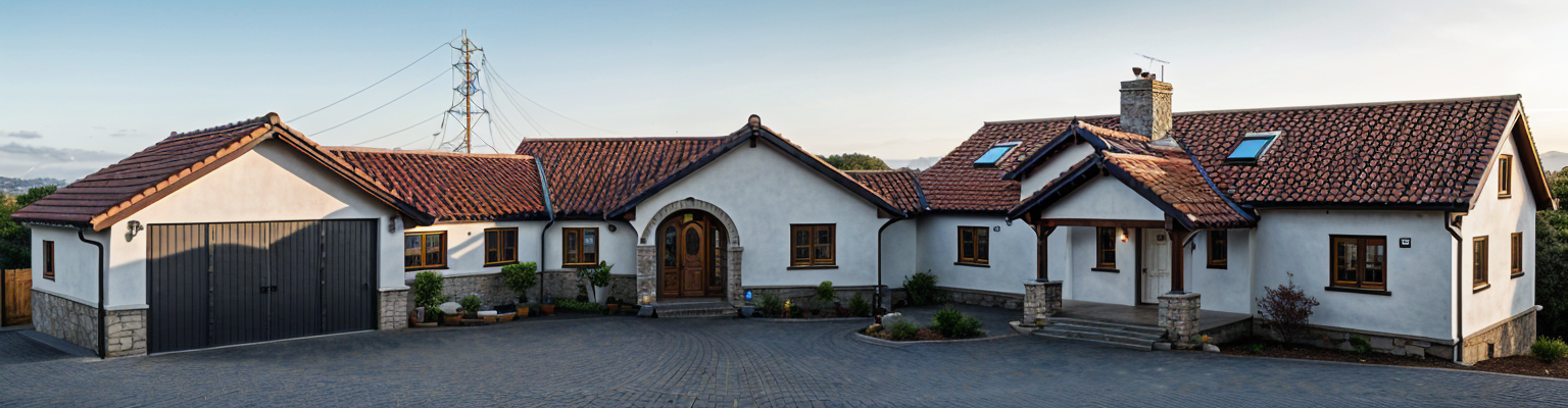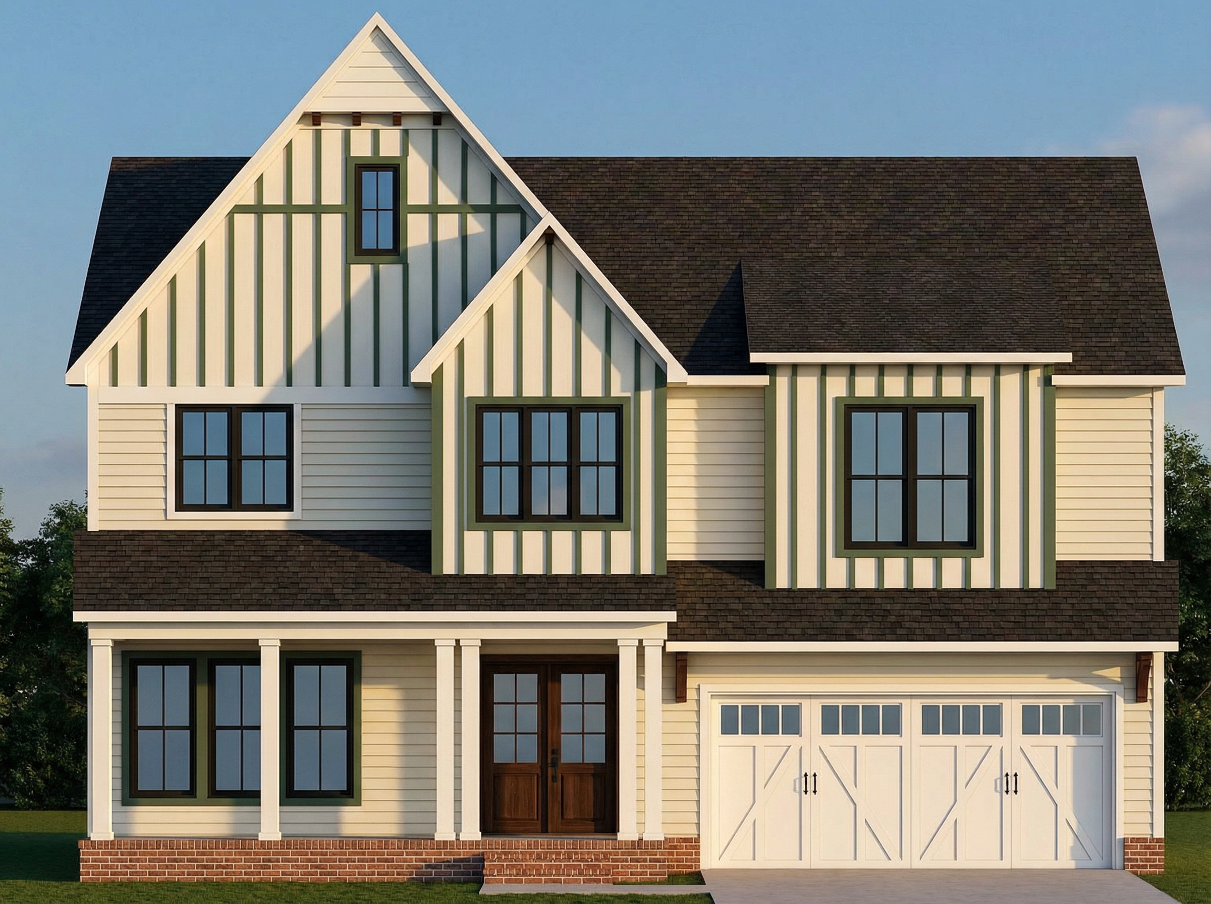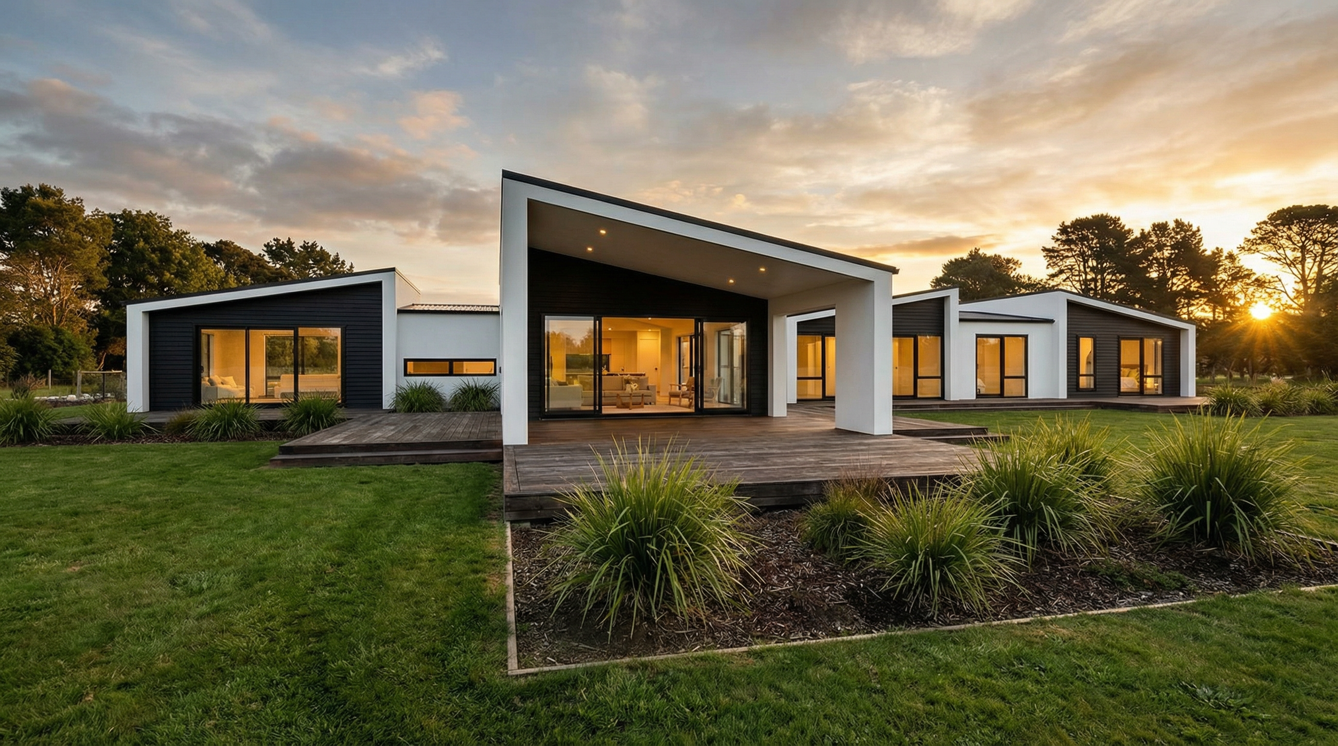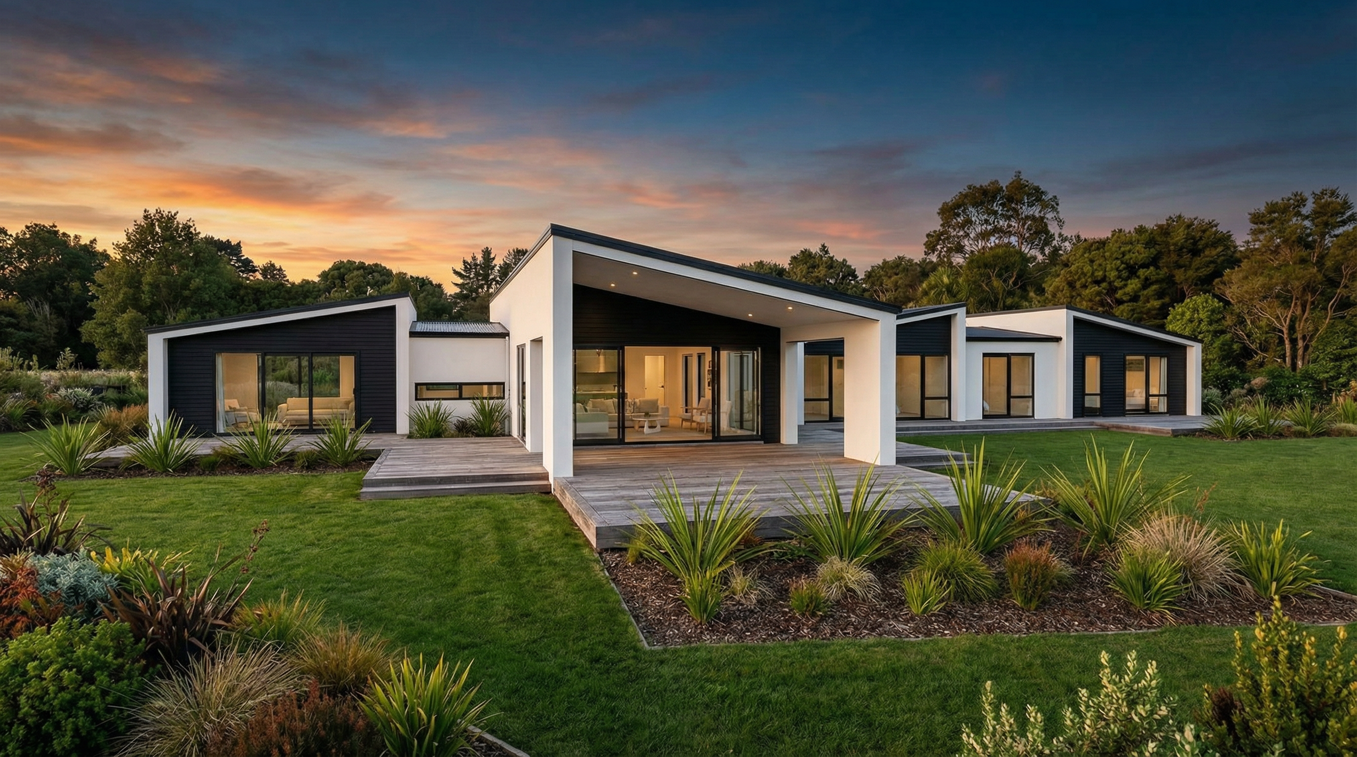 pan left white plaster cladding with black weatherboard features black roof black window frames lawn low timber deck extensive native planting background trees sunset