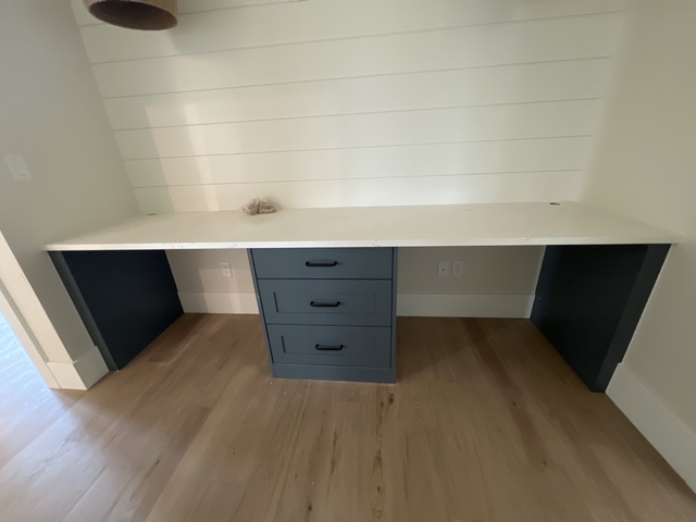 do not change the cabinets in any way preserve the exact cabinet colors materials finishes dimensions door and drawer styles hardware spacing alignment and all geometry exactly as shown do not alter the countertop shape backsplash appliances flooring lighting fixtures or wall structure only remove the construction materials clutter and mess from the scene clean the room and make it look finished and staged add a few simple tasteful home accessories appropriate for the style of the space but do not add or remove any furniture windows or architectural elements maintain the original lighting direction and realism enhance clarity and polish the photo while keeping the cabinetry and room design completely unchanged do not alter the lighting to keep the cabinet colors as they are in the image re stage for a home office