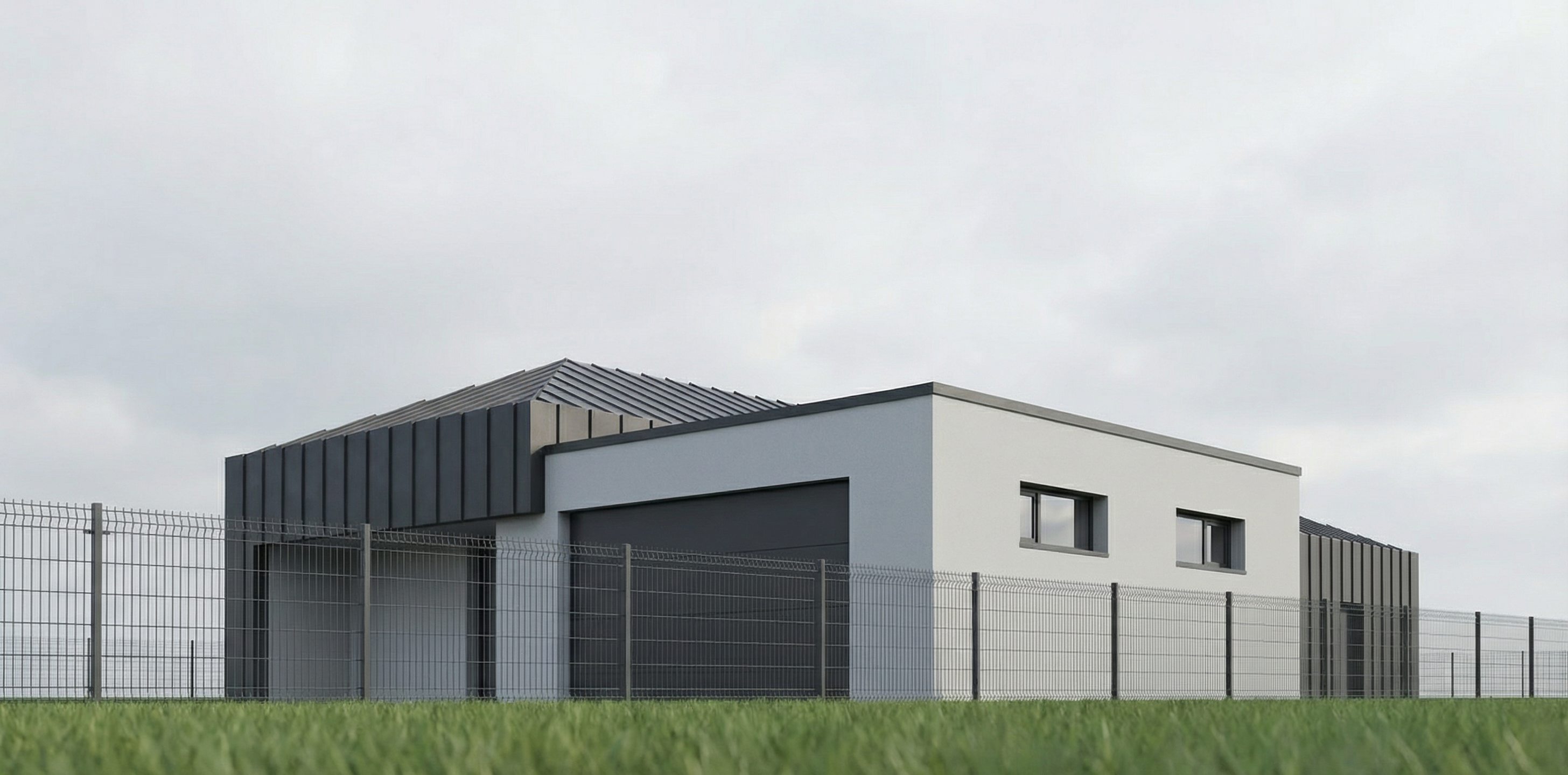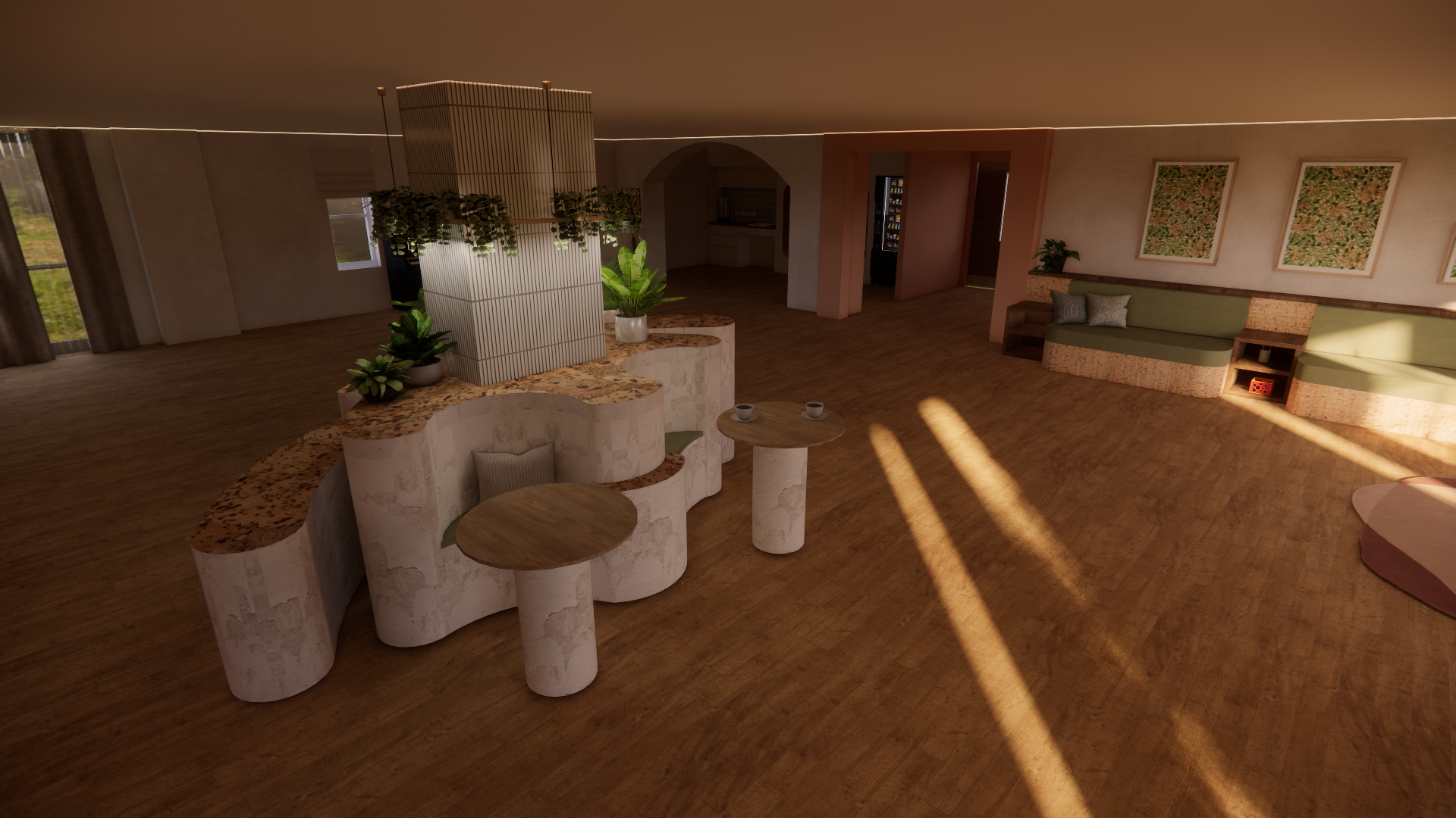 make photorealistic render based on all the details add typical office panelled ceiling add general lighting that is uniformly lights the room add accent lighting lamp is on the pillar is highlighted the room at the back is also with lights of add some accent lighting across the kitchen niche keep all the light on medium brightness