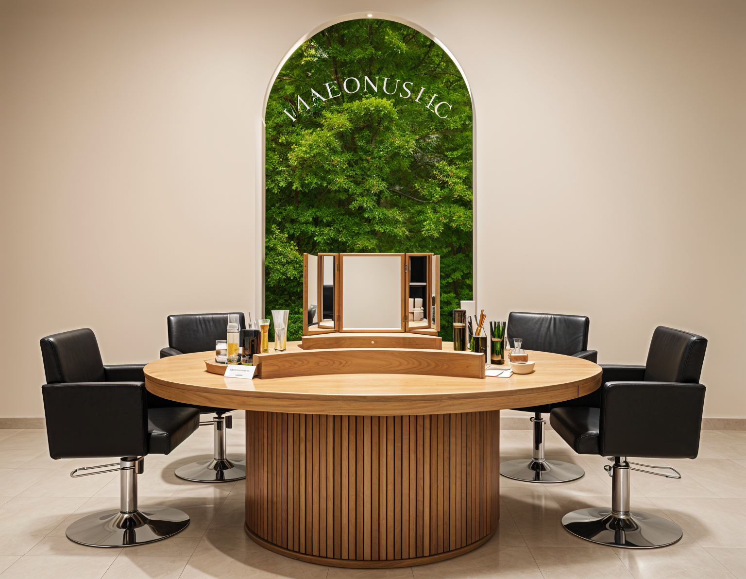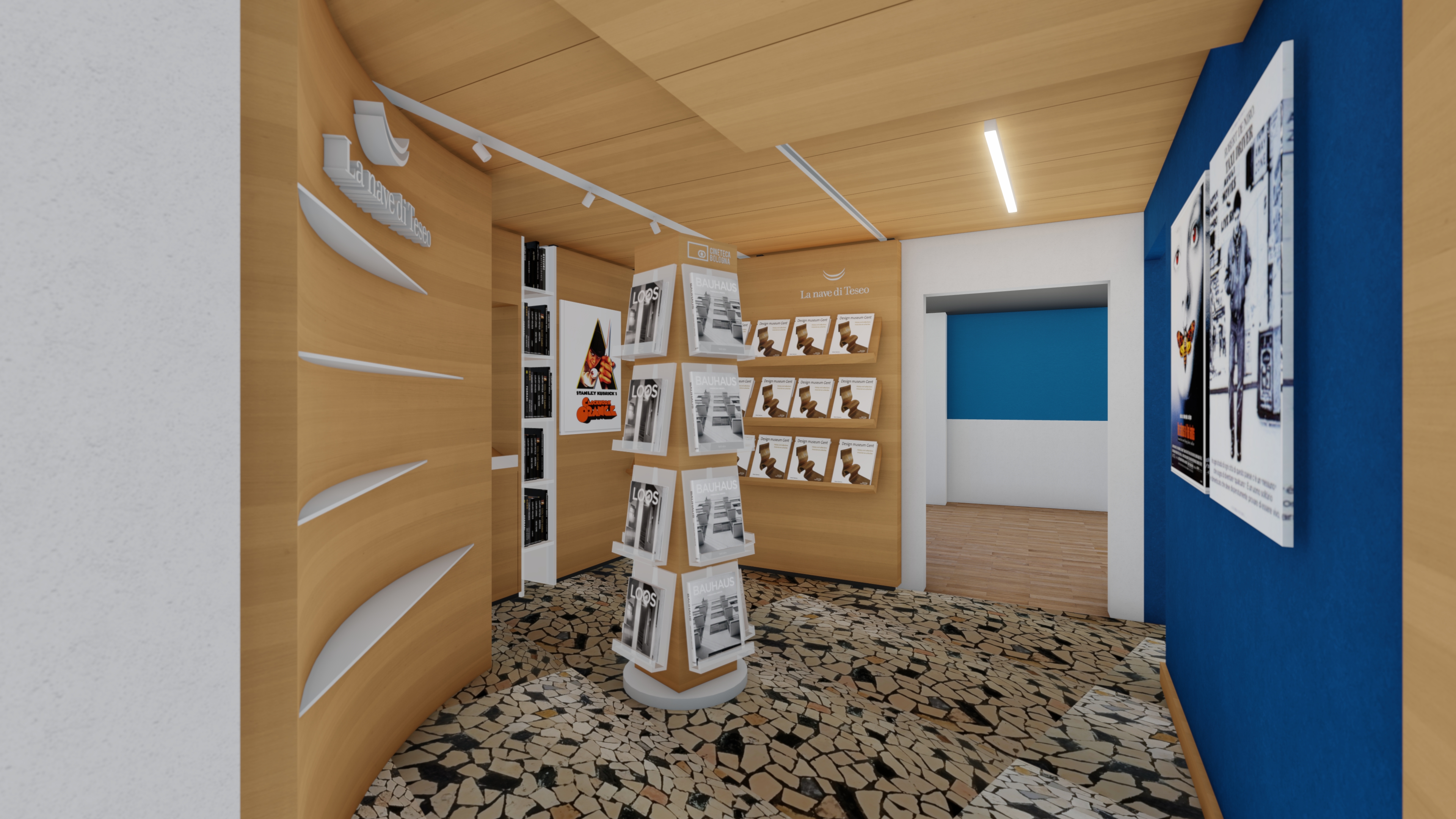 interno di un bookshop con pavimento in palladiana opaco con pezzi neri bianchi e beige pareti rivestite con pannelli di legno chiaro mensole inclinate in legno e mensole orizzontali in plexiglass la luce creata da faretti attaccati al controsoffitto e da una strip led