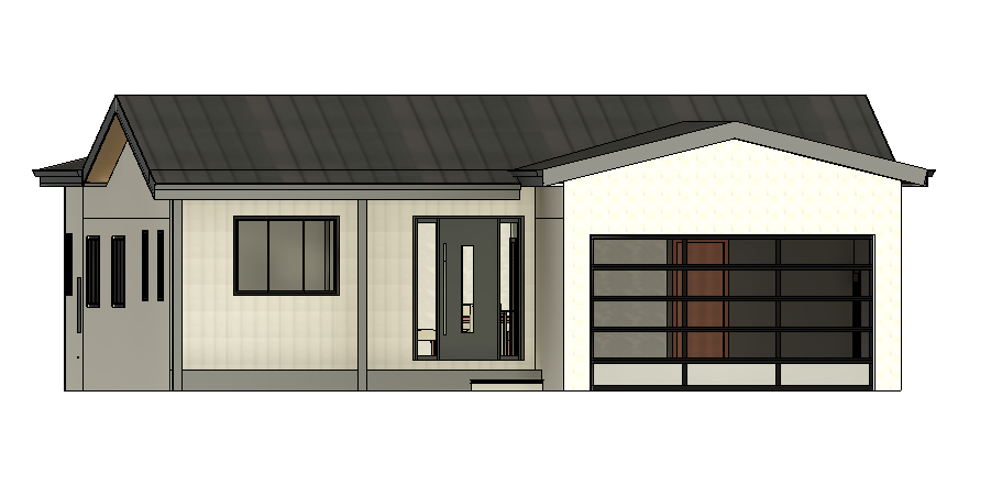 front wall should be white board batten ledger stone should be white limestone make the roof a black standing seam roof
