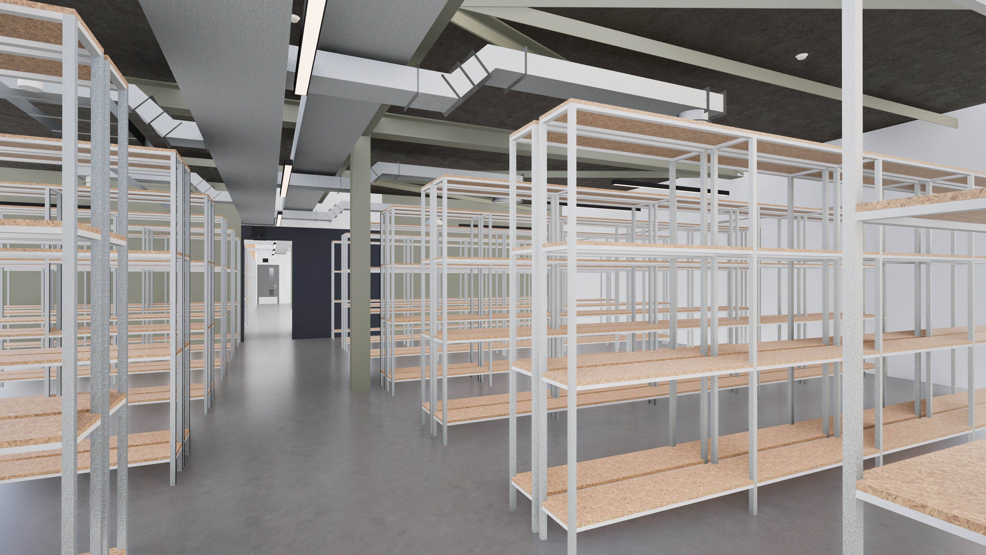 add combination of white and cardboard boxes and plastic crates to shelves plus two or three warehouse workers maintain all architectural elements colour and position