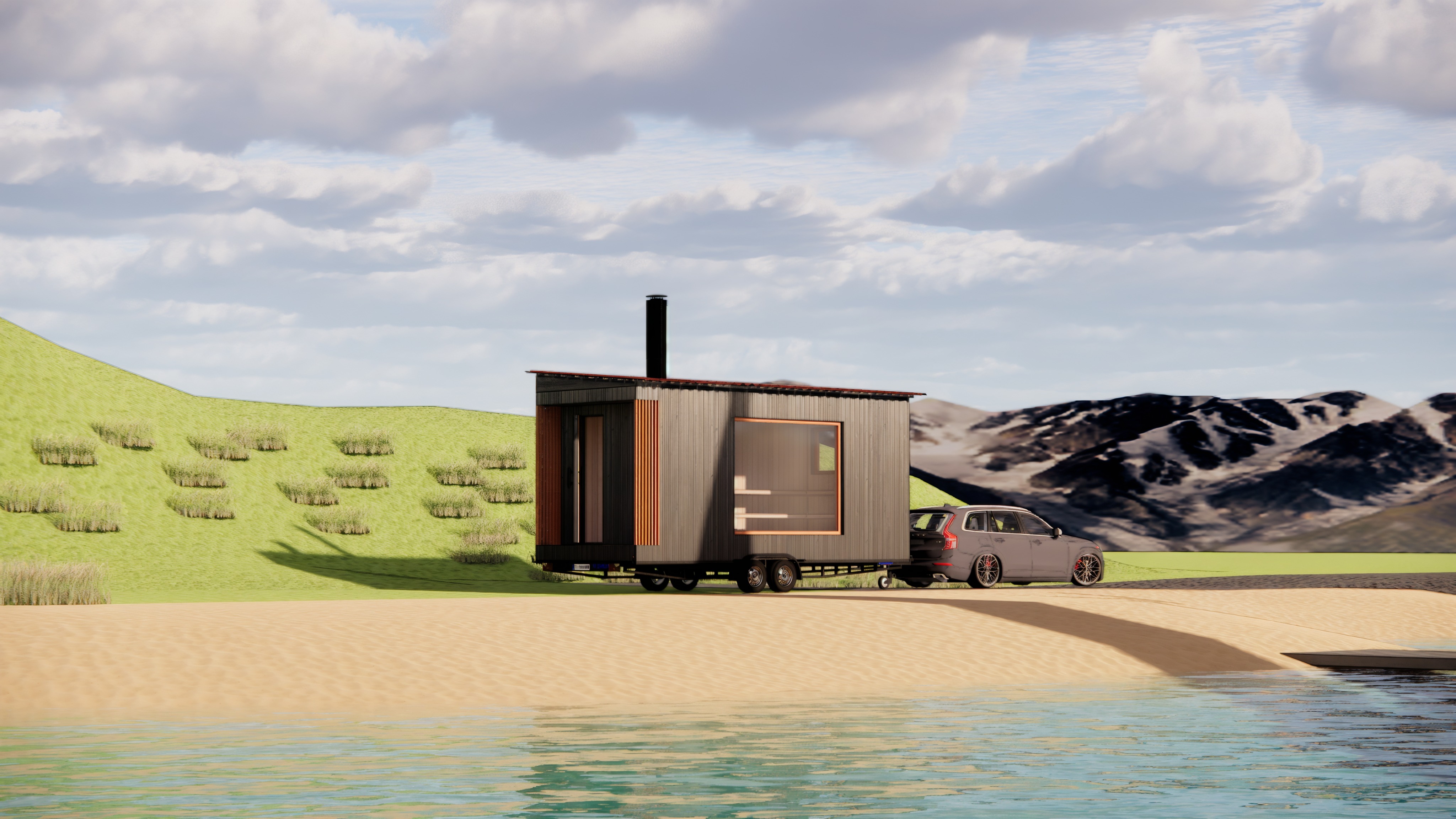 render a photorealistic 3d perspective of this sauna on trailer the current material style keep model geometry the same windows doors roof sky with light atmospheric depth render in hyper realistic architectural visualization quality 8k resolution