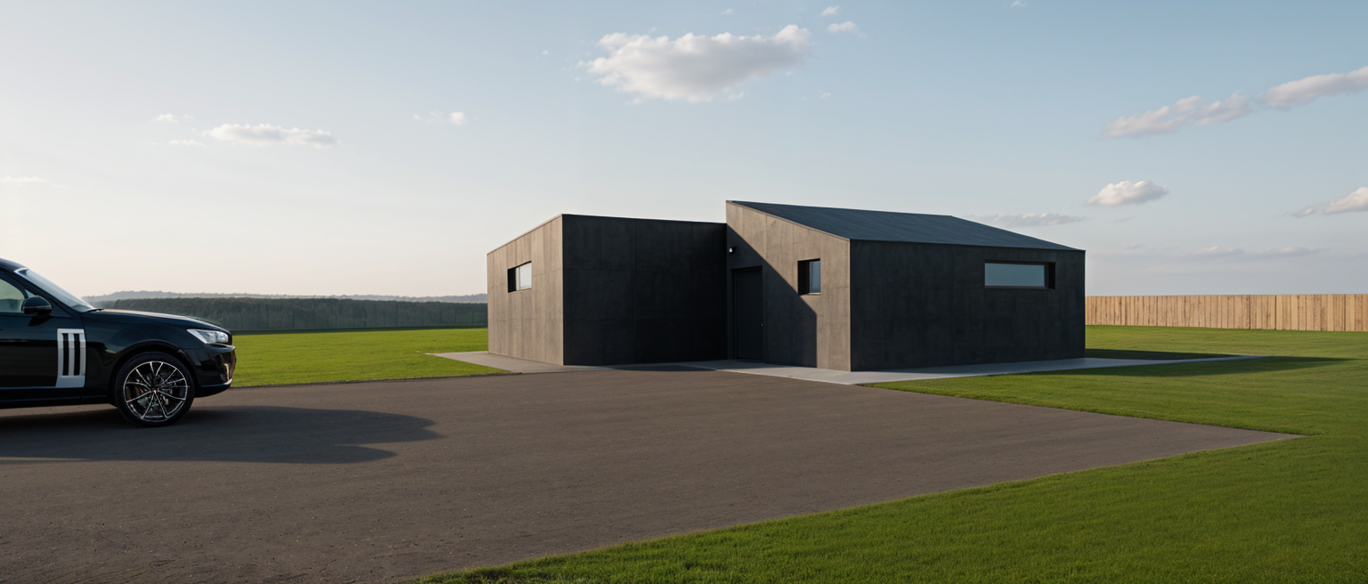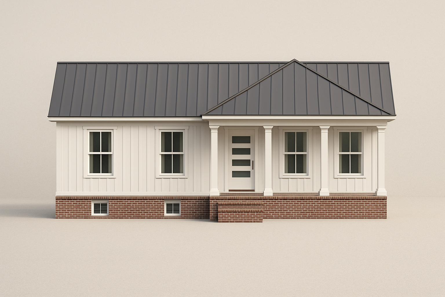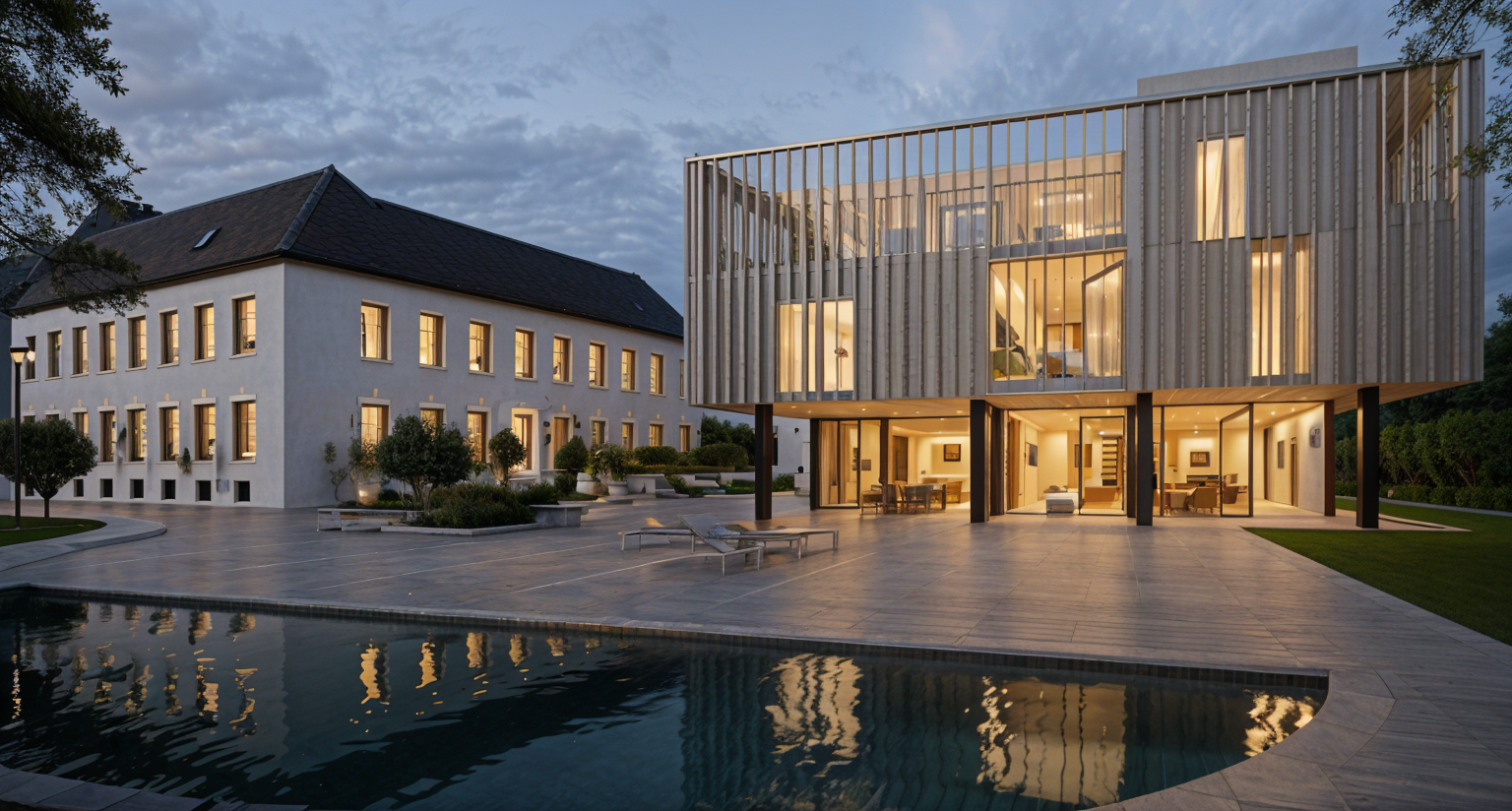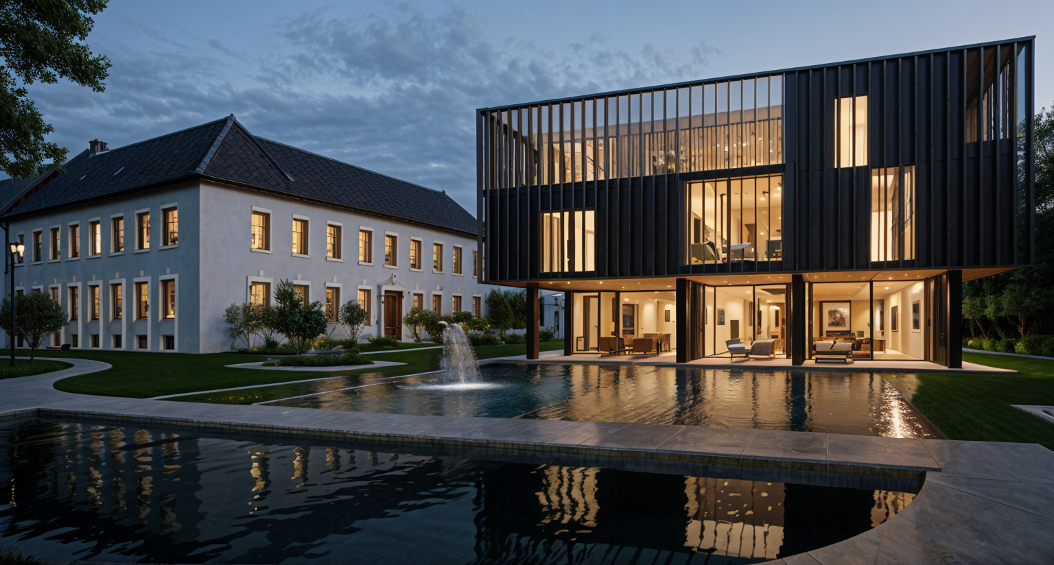 a modern architectural scene at twilight featuring a blend of classic and contemporary building designs the left building is an elegant white colonial structure with soft amber lighting emanating from its windows creating a warm and inviting atmosphere the roof is deep brown complementing the soft twilight sky in shades of calming blue gray on the right a sleek modern building with vertical slats painted in a sophisticated charcoal gray glows with warm golden lights through expansive glass windows medical equipment inside check in desk on the ground floor the white wet pavement reflects the buildings lights enhancing the serene ambiance a smooth reflective pond in the foreground mirrors the scene edged by delicate lily pads exuding tranquility and harmony sparse trees add a touch of nature and softness to the scene completing the peaceful elegant atmosphere bright daylight scene