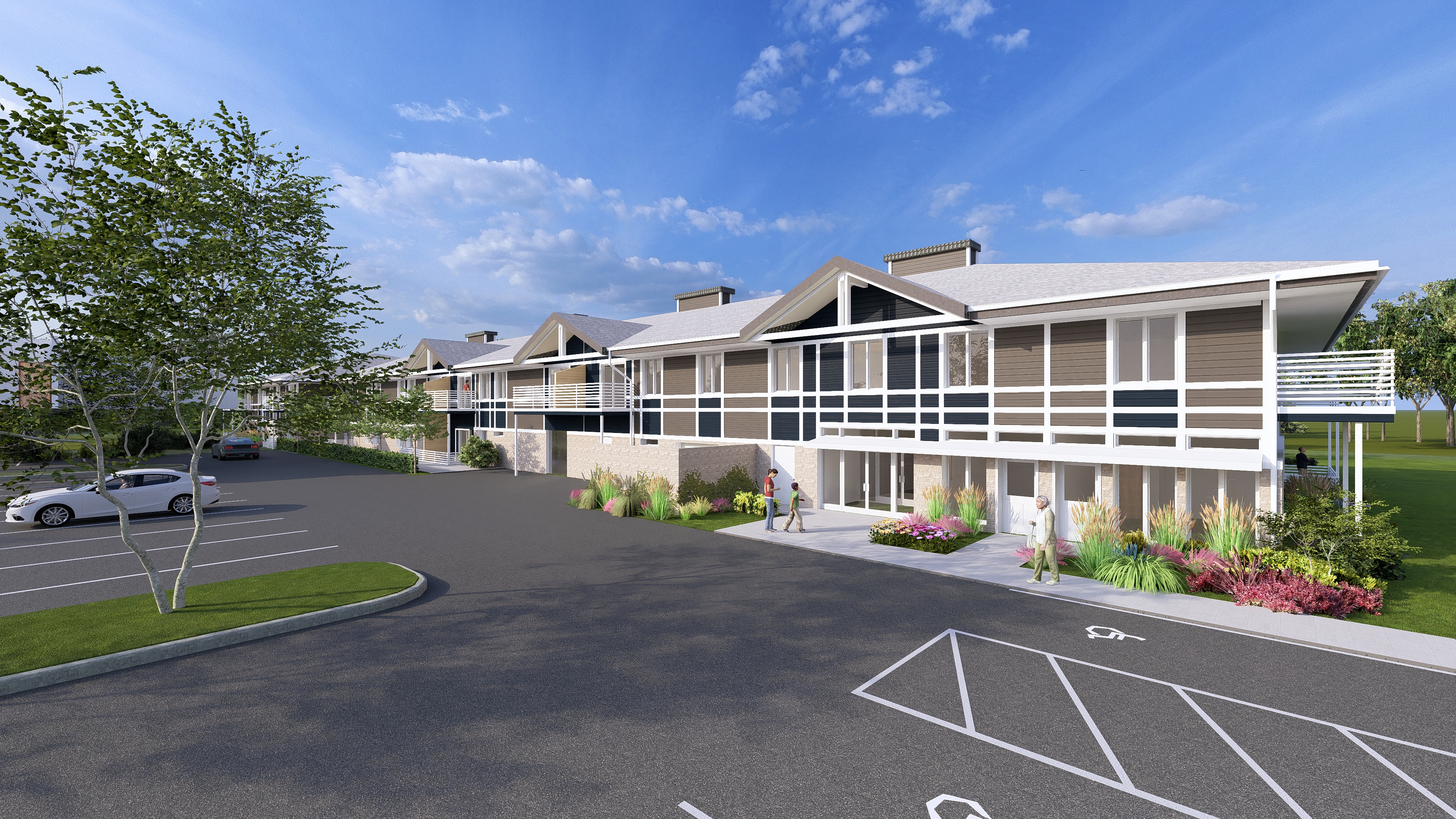 create twilight rendering from this image with illuminated windows with sunset light on this south elevation