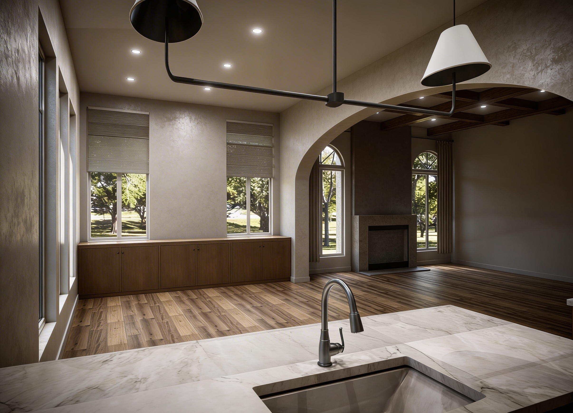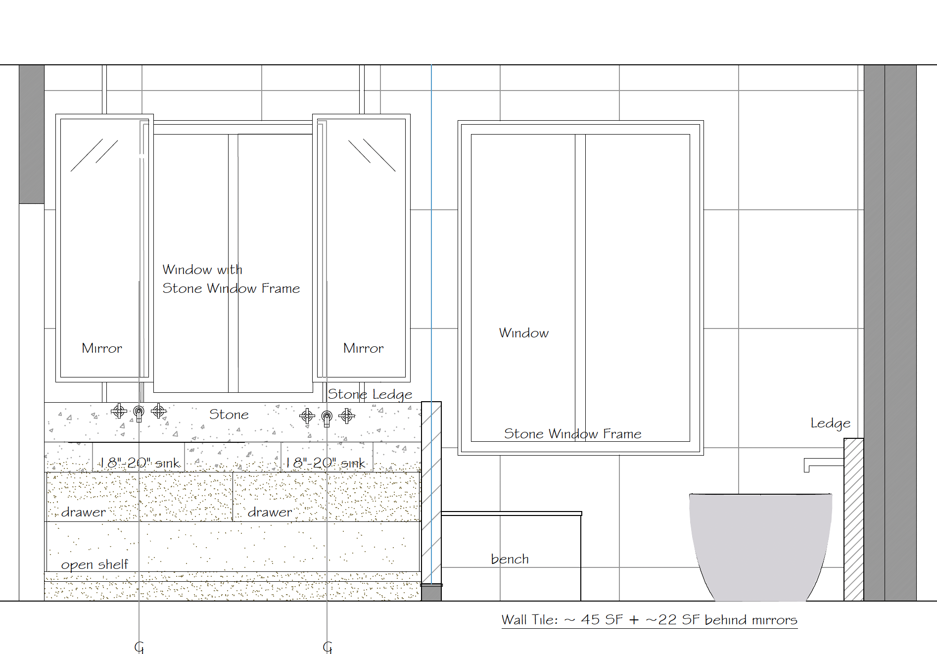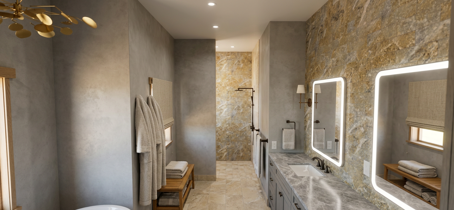 create photo realistic image from this elevation the window are shown in black but should be shown as glass tiles are white marble counter is cream quartz faucets are chrome tub is white remove all text