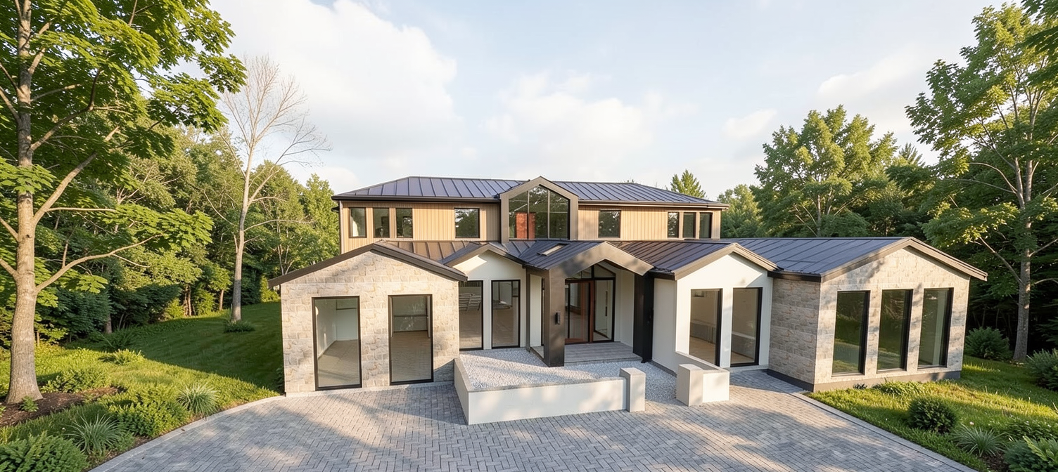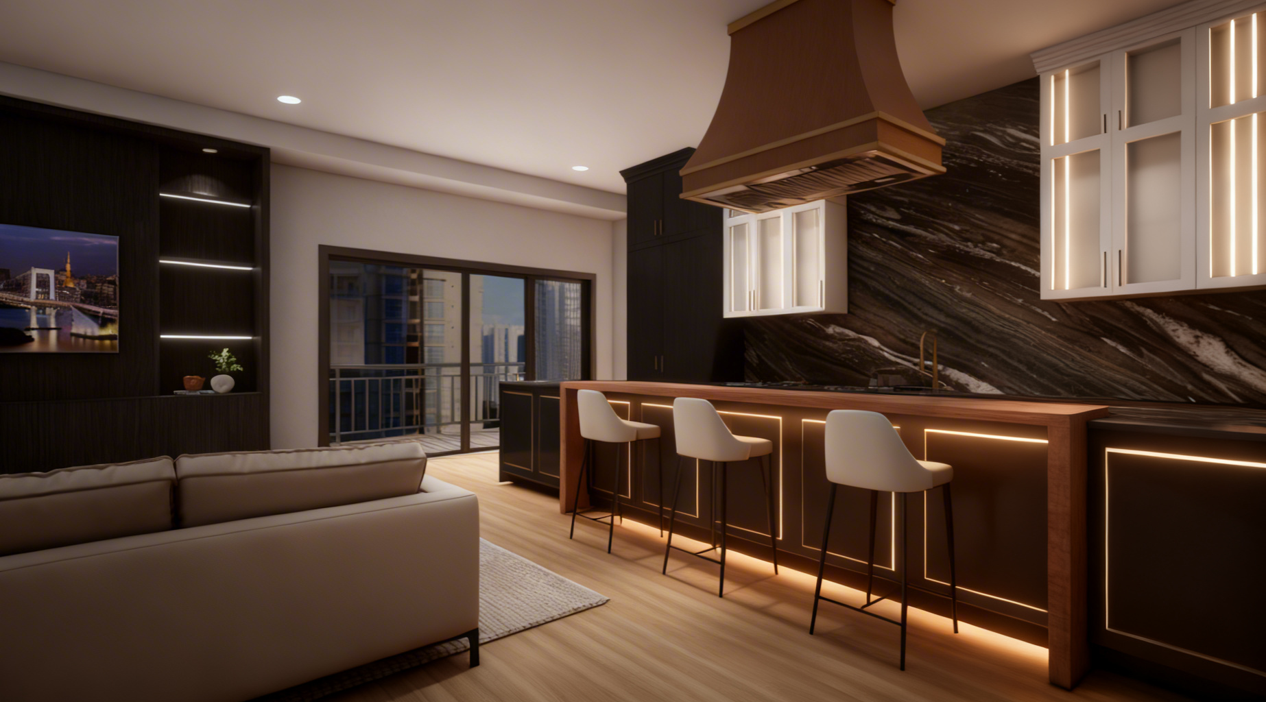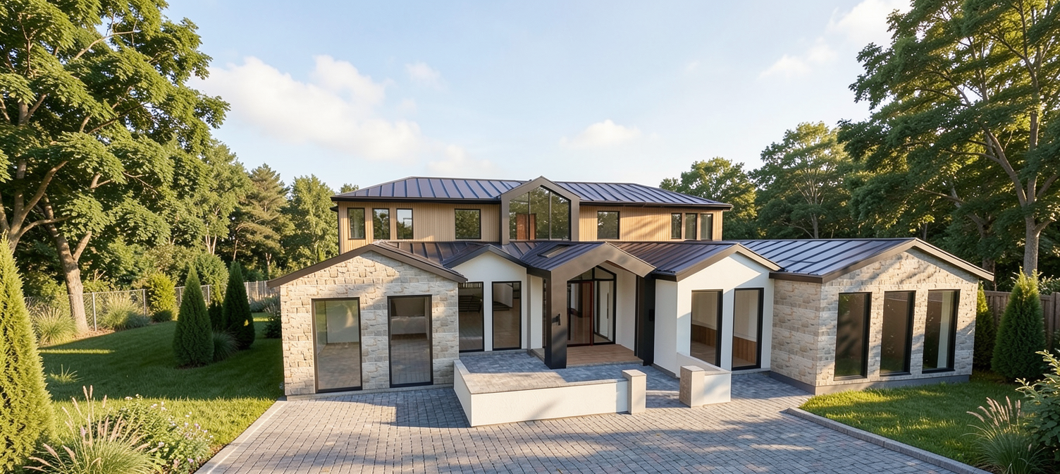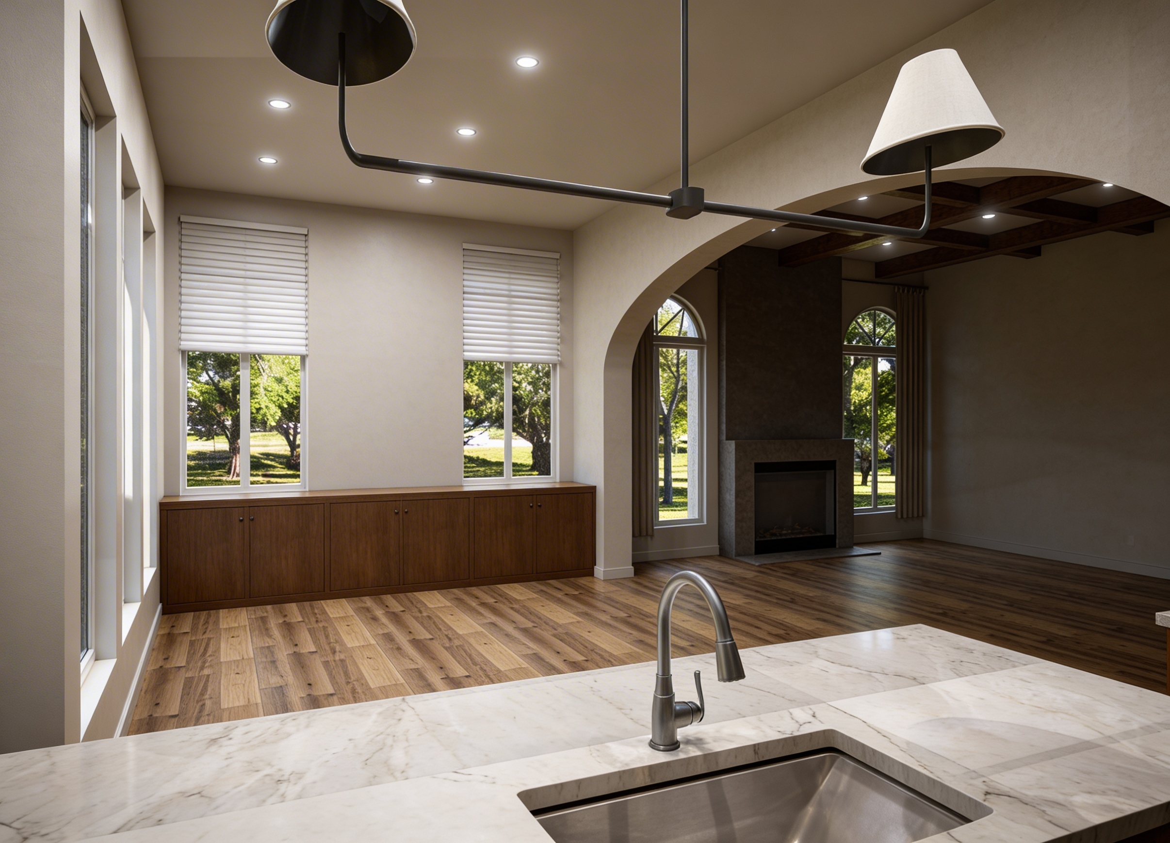 create photo realistic image from this elevation the window are shown in black but should be shown as glass tiles are white marble counter is cream quartz faucets are chrome tub is white remove all text
