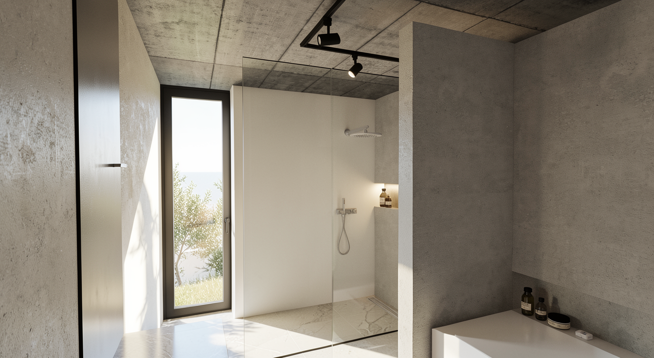 render senyata mungkin dengan ambien cahaya off white warna kayu lemari hitam tambahkan indirect ligth di dalma lemari kaca di rak dekat meja rias dan di cermin meja rias tambahkan 1 pajangan di setiap rak di meja pajangan kaca lemari abu tembus lemari warna krim sesuai dengan peletakan warna di gambar asli