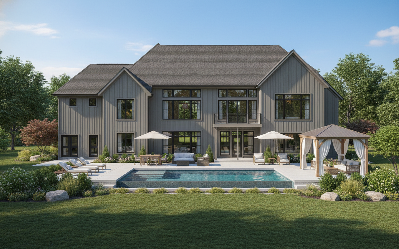 add a riverpools x36 model pool cedar gazebo with curtains add outdoor furniture make the siding iron ore paint colored no stone or brick on the house black windows do not change the layout add landscaping zoom out far to show landscaping and house make the deck all brushed concrete add dining table and chairs no steps put the gazebo to the left make it look fancy add black stairs from the second story deck coming straight out away from the house on the right side of the deck