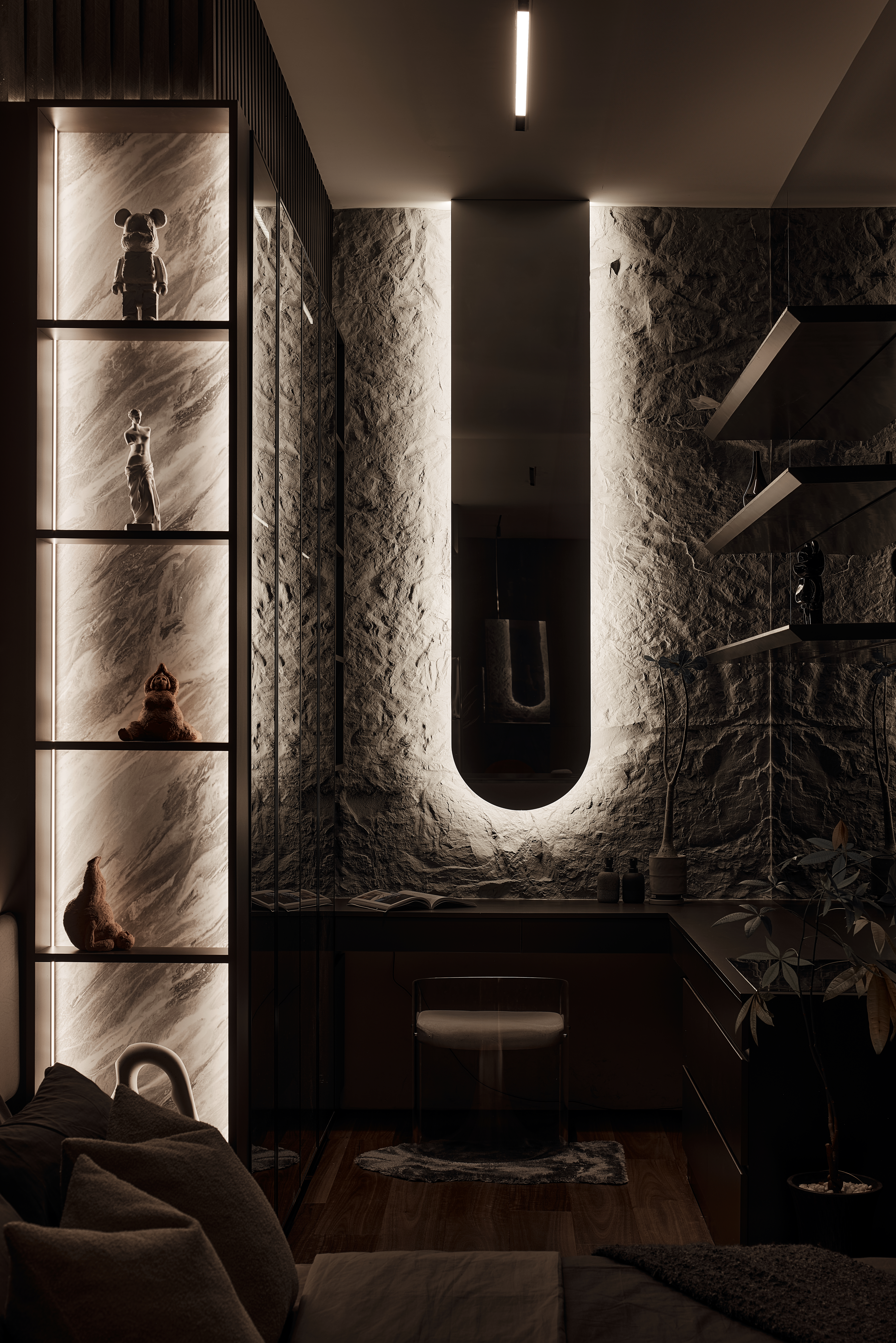 add a short korean model sitting on the chair facing the mirror infront like she is doing her make up
