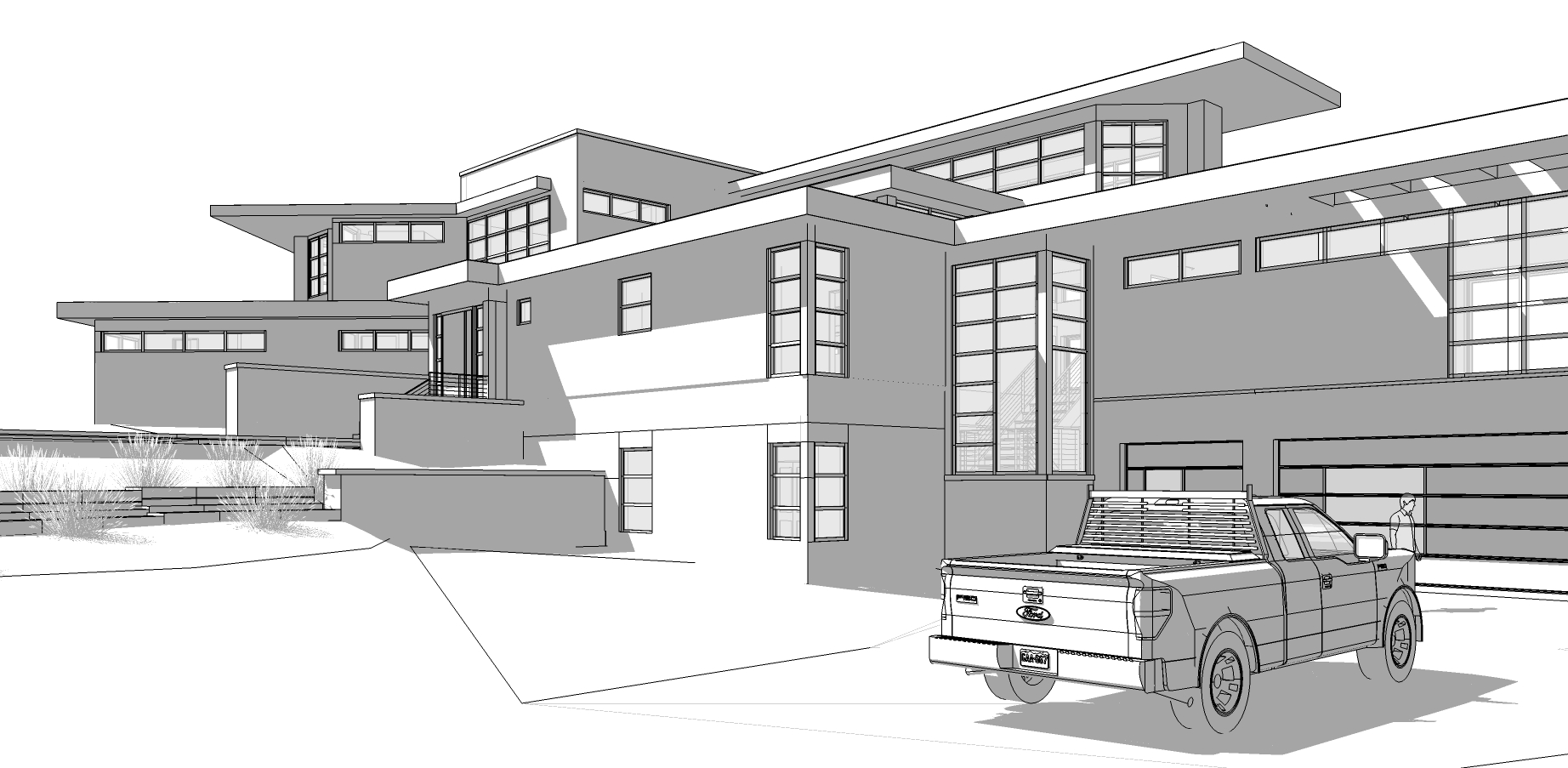 industrial home design vertical dark wood shiplap matte black metal panels black fascia tall grass foreground fog dusk