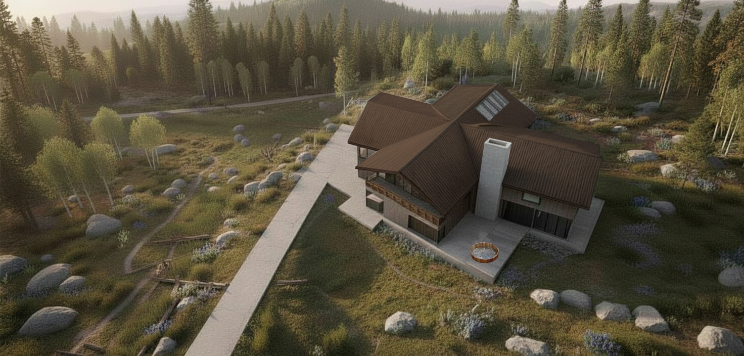 sunny day after a snowfall ultra high end v ray style final polish of the attached contemporary multi level home on a sloping hillside under full middle day springtime daylight and gentle snowfall maintain the exact camera angle composition layout colors and geometry without altering any architectural details roofs should show an accumulation of snow refine all materials for photorealistic detail