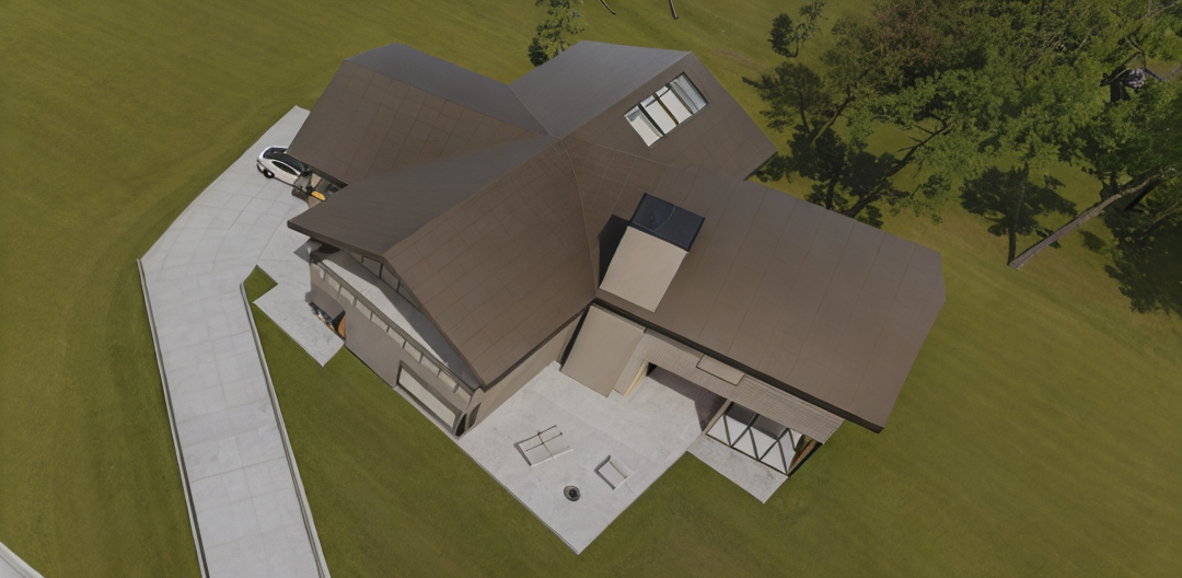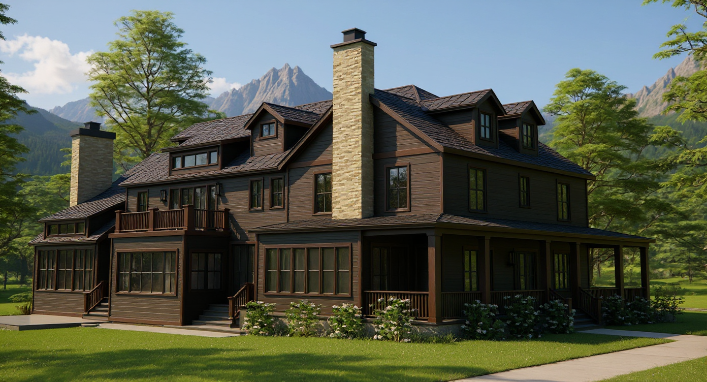 i m trying to decide what color to make the house can you put a combination together i m thinking a darker color to give it a moody look make it nice and sunny outside also change the metal roof to shingles put the house in the mountains make it a grey color can you make the chimneys stone a darker stone make it more of a slate color not brown