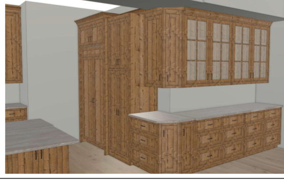 render this image change the countertop and full height back splash to taj mahal quartzite change the cabinet pull hardware to gold add under cabinet lighting