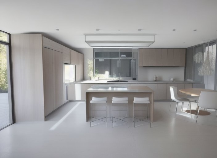 exterior shot modern office interior featuring a spacious room with a minimalist design the walls and ceiling are textured in concrete gray with sleek red piping for an industrial touch large circular pendant lights hang from the ceiling radiating soft ambient white light desks are uniquely curved and colored in soft white paired with modern black office chairs a prominent lush green indoor plant adds a refreshing touch along with subtle green accents on the books in the background shelves the atmosphere is calm professional and contemporary with an emphasis on open space and natural elements