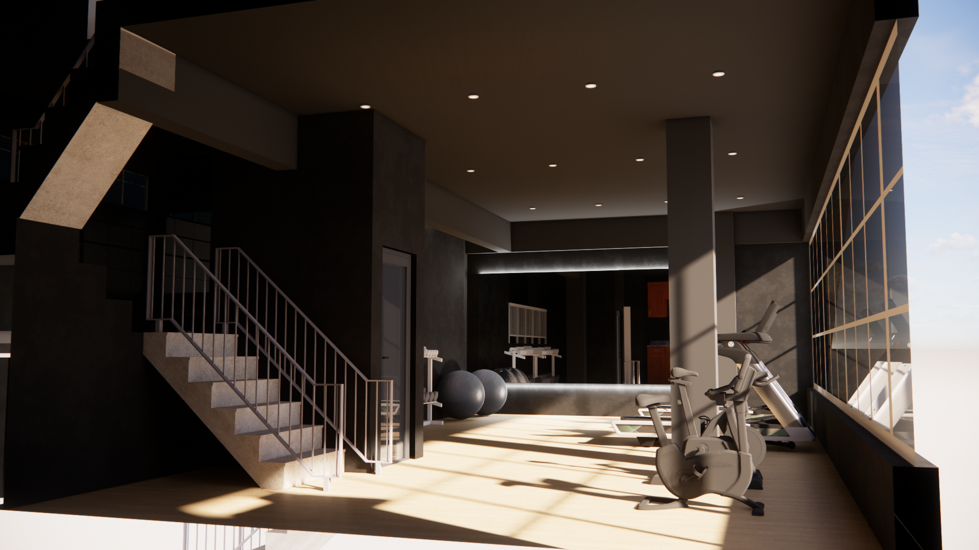 render a modern gym interior with large floor to ceiling windows letting in natural light filling the space with a bright and airy atmosphere the walls and ceiling are sleek and dark gray creating a sophisticated contrast with the light wood flooring include a staircase with metallic railings and concrete steps adding an industrial touch the gym equipment like stationary bikes and yoga balls is in neutral tones of gray and black the lighting is warm and subtle with spotlights embedded in the ceiling enhancing the contemporary elegant feel the overall ambiance is calm inviting and focused combining minimalism with functionality