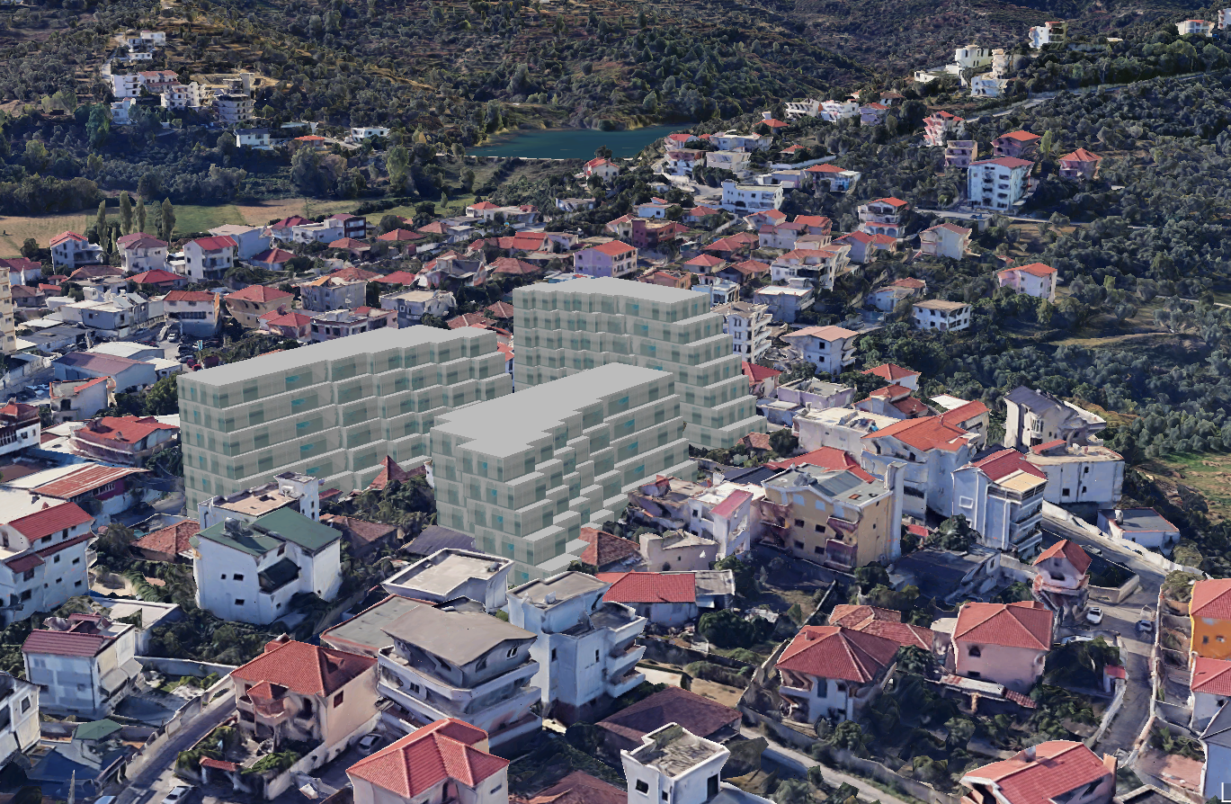photo of modern residential buildings nestled within a suburban landscape showcasing glass facades and sleek lines emphasize textures of glass and concrete with balconies providing outdoor space the surrounding area features traditional houses with red roofs set against lush green hills bright daylight casts soft shadows enhancing the building s transparency aerial perspective with a wide angle lens captures the contrast between modernity and tradition in the urban context