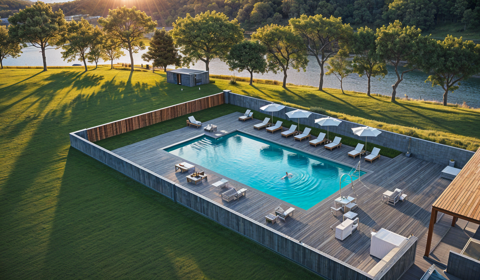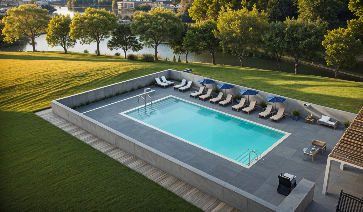 community pool setting the pool is setting on top of a slope there is a fit pit at the top of slope over looking a forested slope with a river below there is a parking lot beside the pool for residents as shown in reference picture concrete surrounds the pool and there is a metal fence surrounding the concrete architecture