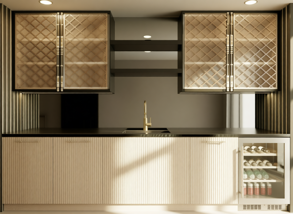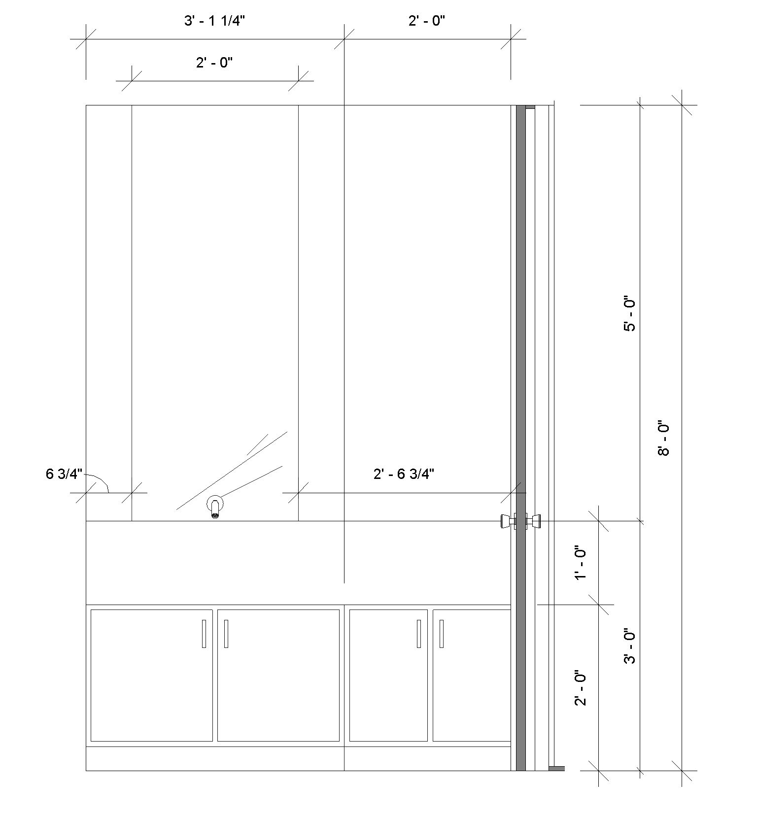 powder room half of back wall is mirror and remaining is marble that is back lit wall mount gun metal modern faucet countertop and front 1 matching marble lower matte dark walnut cabinetry cream limestone tile floor modern simple and clean aesthetic do not show dimensions on rendering
