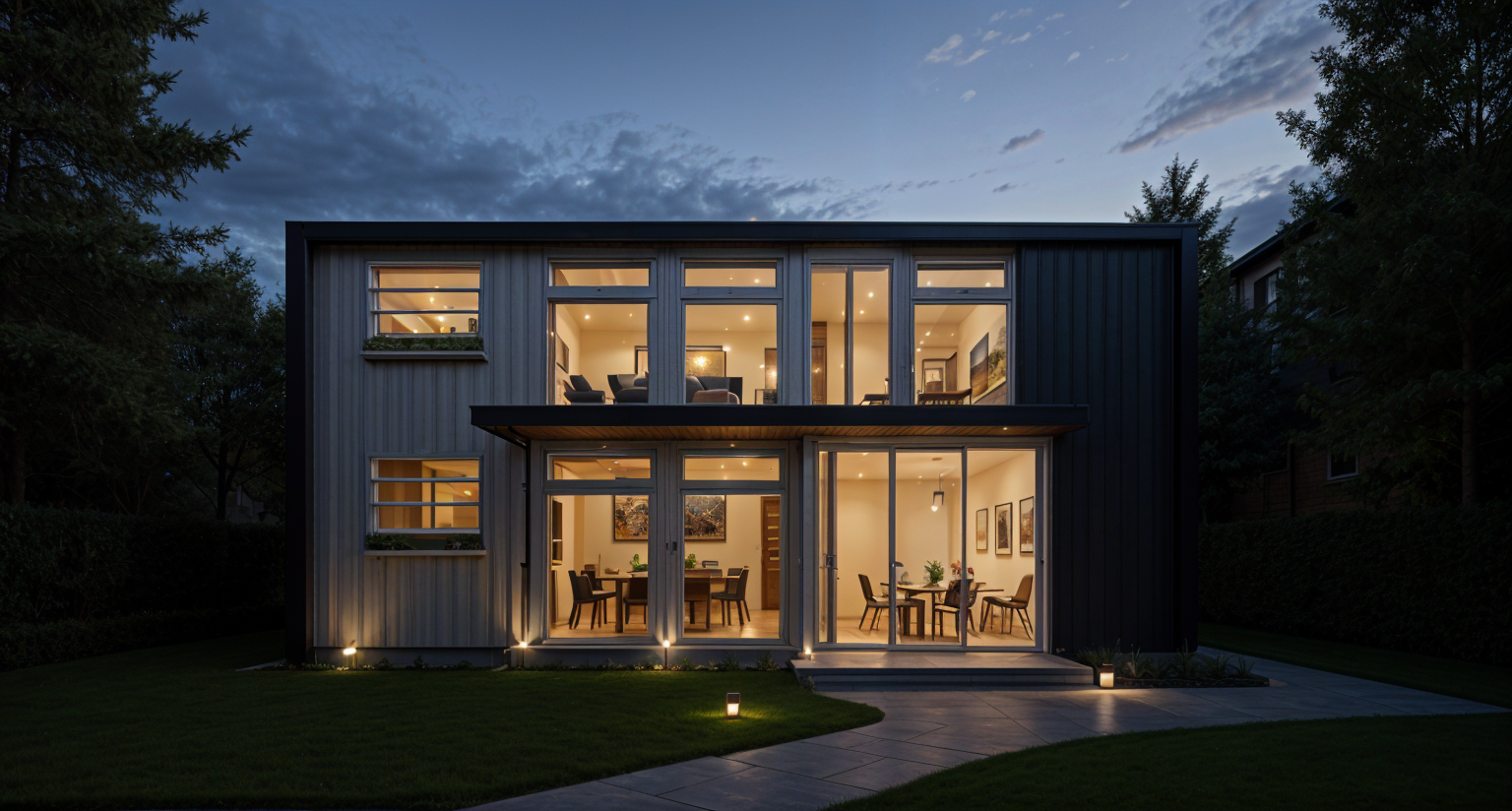 contemporary exterior shot in an australian rural setting at sunset with a lush green garden external colour pallette of white and soft grey architecture