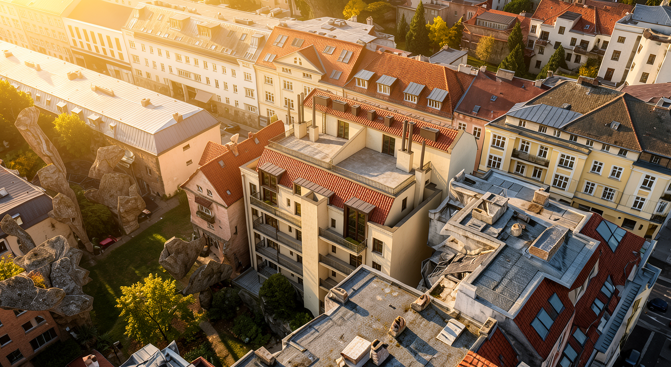 enhance it taking inspiration from the references the first reference is about the roof of the right building
