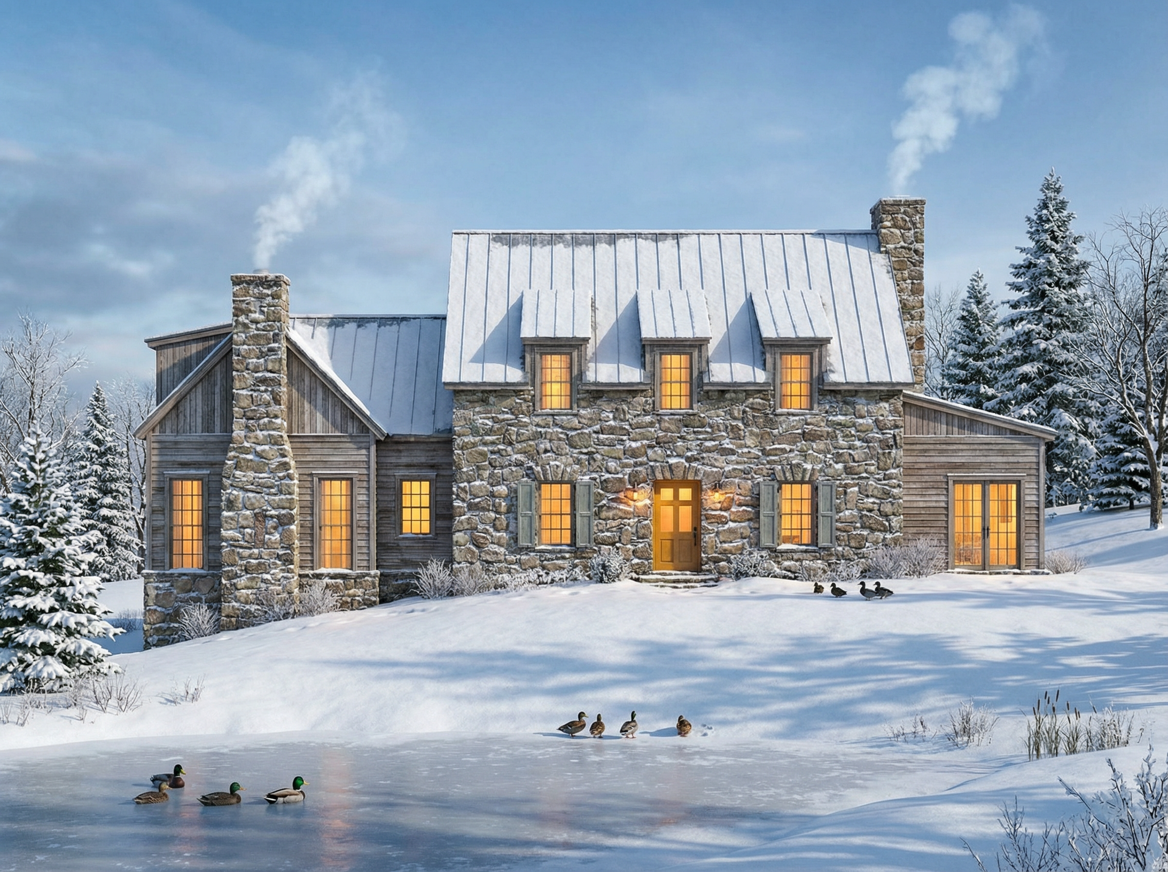 render to this similiar style but make it ducks and winter with a warm glow comiung from the windows make more phtoto realistic makeno snow on stone of house and less on roof and soften the warm glow from windows