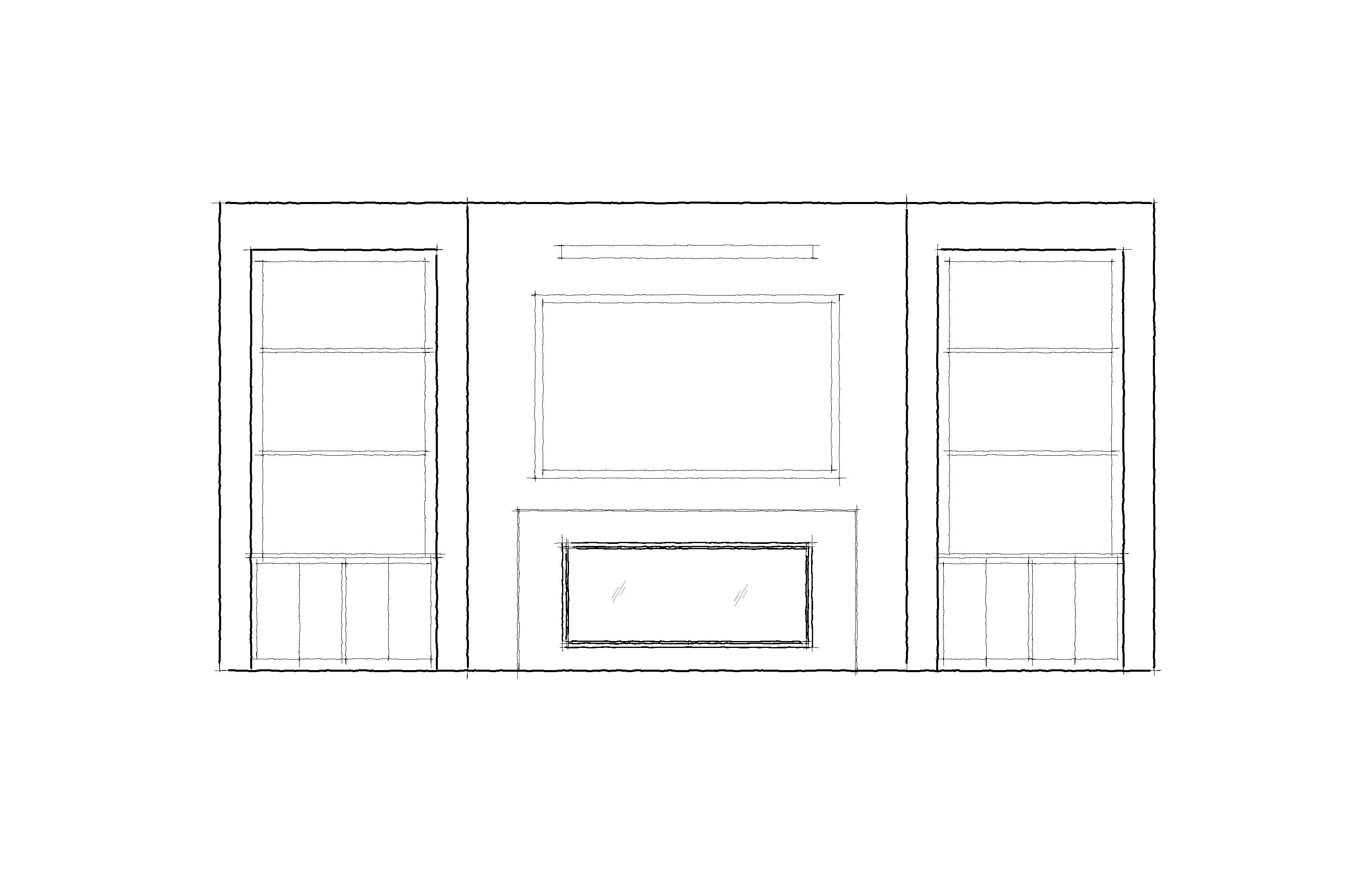 create a photorealistic interior rendering of a custom fireplace feature wall in a modern transitional style straight on elevation view the center features a rectangular fireplace with a slim matte dark charcoal steel surround deep graphite tone subtle texture not glossy above the fireplace is a flush mounted samsung frame tv with a thin black frame displaying neutral abstract art the fireplace chase extends floor to ceiling in warm off white plaster with subtle hand troweled movement on both sides of the fireplace are symmetrical built in units with lower inset cabinets in light natural white oak warm honey beige tone matte finish no red no gray the cabinet faces side panels and vertical dividers are wood the outer surround of the cabinetry is wood not metal above the lower cabinets are open shelves important material clarification the horizontal shelves themselves are dark charcoal steel matching the fireplace surround the shelves are thin metal plates minimal profile floating appearance the vertical supports for the shelves are also dark charcoal steel the wood should only appear on lower cabinet doors cabinet face frames and side panels interior cabinet backing optional the metal should only appear on fireplace surround all open shelving horizontal shelves and vertical supports do not wrap the cabinetry in metal do not make the shelf surfaces wood the shelving planes must clearly read as dark steel flooring wide plank light natural oak similar tone to cabinetry lighting soft daylight subtle shadowing to emphasize contrast between warm wood and dark steel high resolution architectural visualization realistic materials balanced contrast