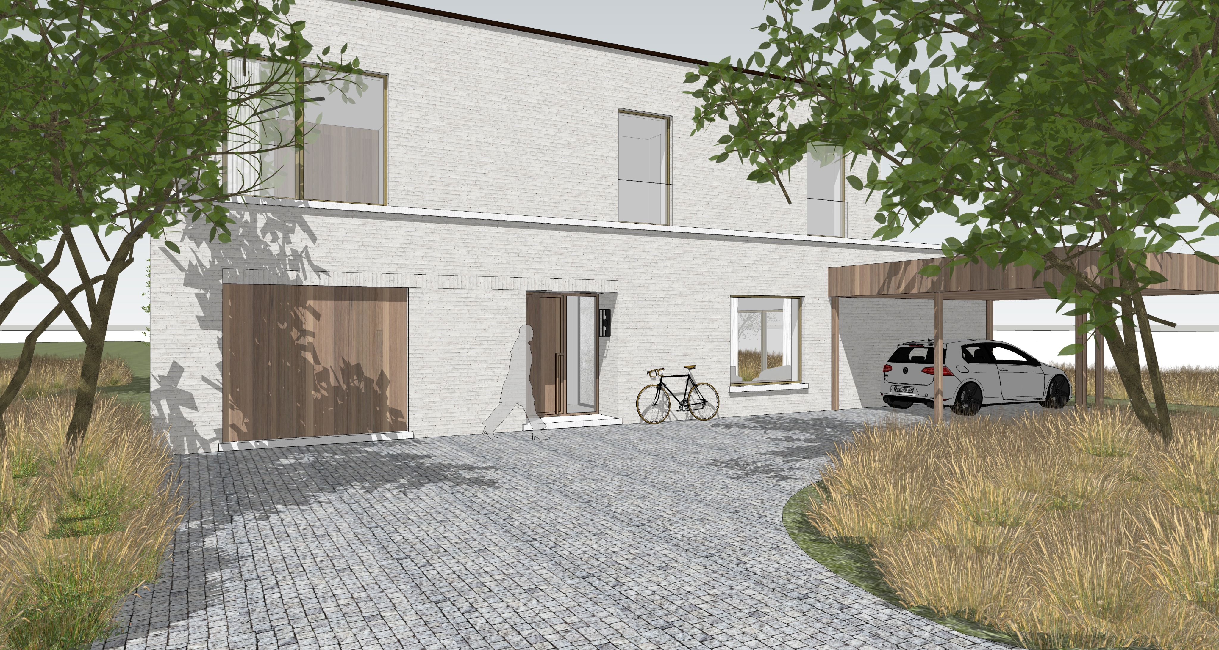 ultra realistic architectural exterior render of a modern residential house the fa ade is made of camargue carrera facing bricks from heylen ceramics with realistic texture subtle white grey color variation and natural mortar joints aluminium window frames in supranodic collection bronze with realistic reflections and glass natural landscape surroundings neutral environment soft daylight realistic shadows photorealistic high detail architectural visualization audi a3 int the driveway the front fa ade features afromosia wood with warm tones and visible natural wood grain in a grey warm tone