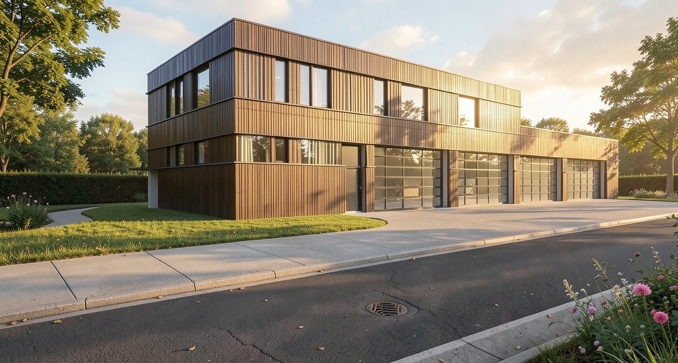 create a photorealistic luxury wedding dinner scene based strictly on the provided image important keep the architecture columns beams windows staircase and room structure exactly as shown in the original image do not change add or remove structural elements the front frame structure must remain exactly as in the original rendering fabric concept use lightweight ivory chiffon fabric soft translucent and flowing the fabric must look airy and elegant not heavy curtain fabric the draping should resemble professional wedding chiffon installations used in luxury event design wall draping install continuous light beige chiffon draping along the walls mounted to the beam structure the fabric should create soft vertical folds with natural movement the draping should continue across the walls and above the windows while being softly opened and gathered to frame the windows ceiling draping the chiffon fabric should also create soft ceiling swags suspended between the beam structures flowing lightly across the space table draping very important the tables must have dark forest green chiffon table draping that reaches the floor on all sides important this is not a standard tablecloth the fabric should fall continuously from the tabletop to the floor creating soft vertical fabric folds similar to event table skirting or draped banquet tables the draping must be fully floor length table styling each place setting includes silver charger plate silver cutlery wine glasses water glasses no floral centerpieces rendering style ultra photorealistic luxury wedding event soft natural daylight realistic chiffon fabric folds elegant event styling high end wedding design professional event photography look