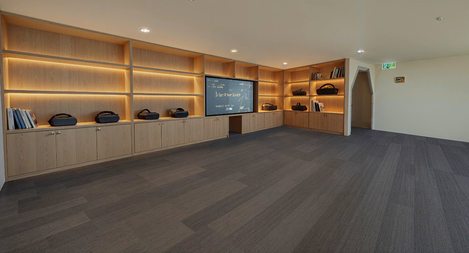 add 4 modular tables and 15 chairs and children seated and playing with vr goggles