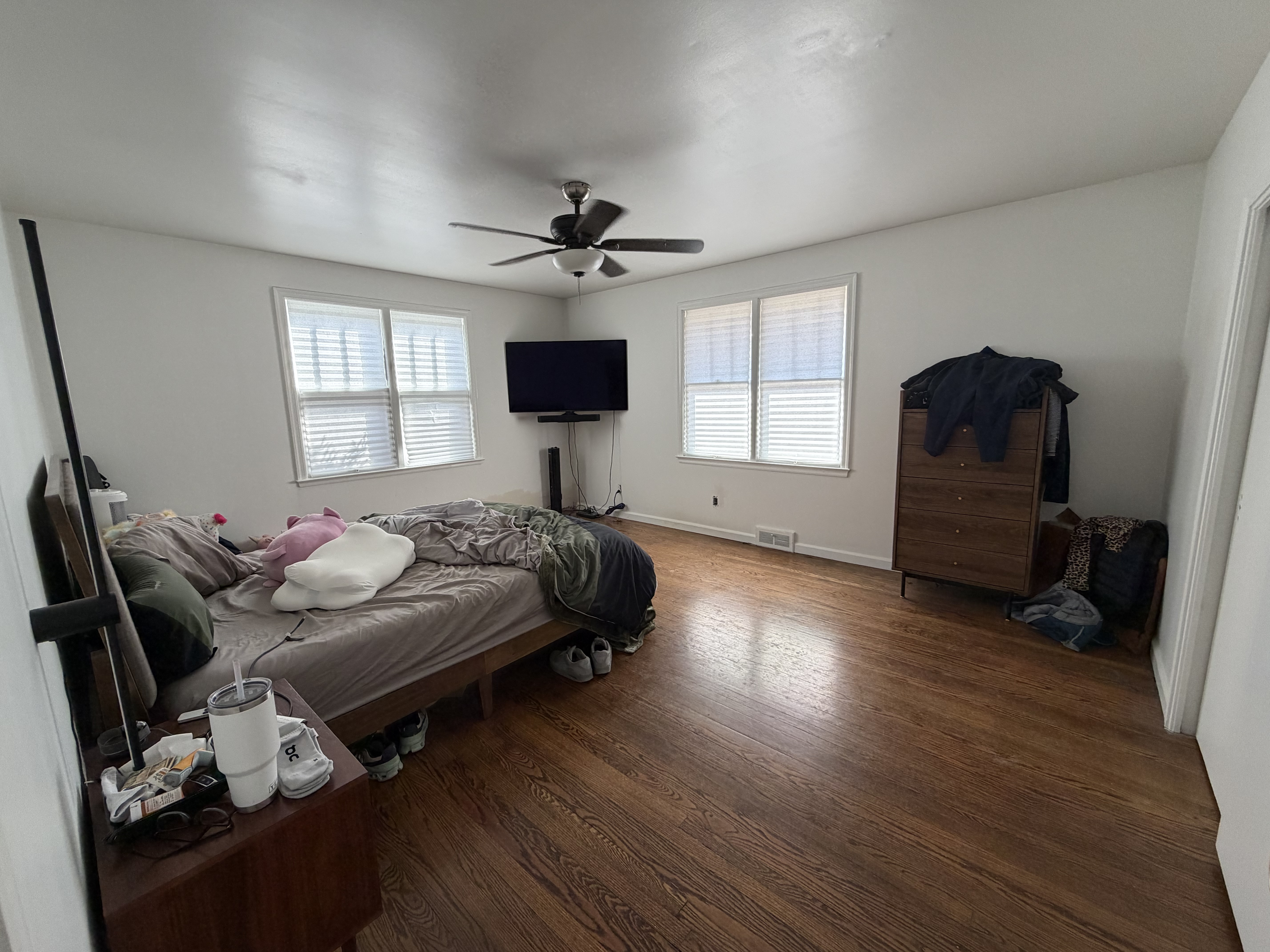 create a stunning master bedroom that includes color washed walls and adds full length curtains wall to wall and adds smart storage