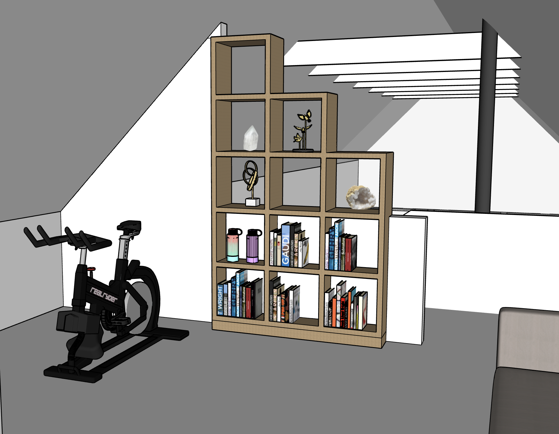 floors are white oak all walls are painted white no skylights on left side stovepipe is black valted ceiling