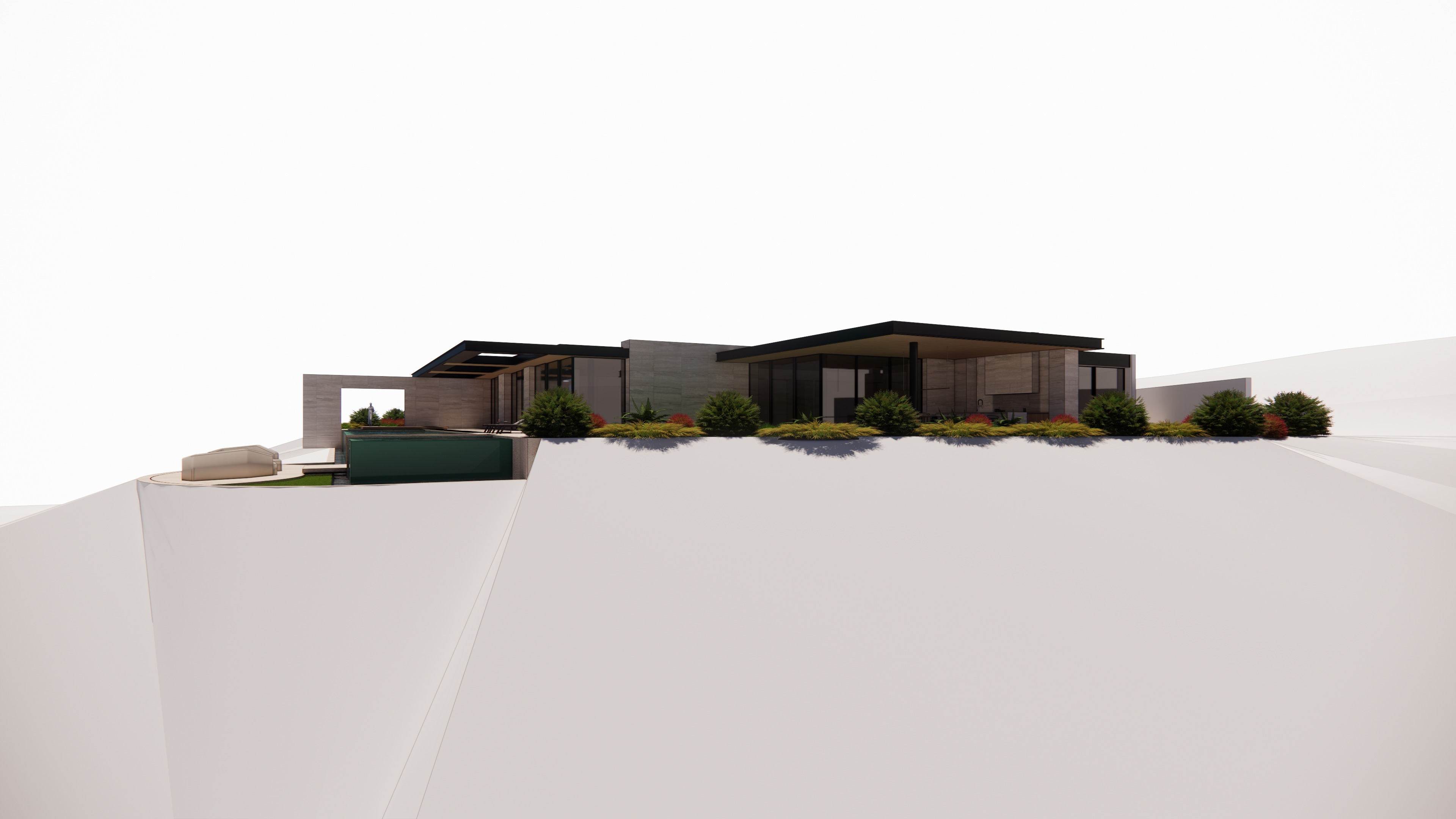 create a photorealistic rendering this is an aerial view of the back side of the house the walls are travertine stone tile the floors and the stairs are limestone in the lower level going down the stairs there is a seating area with a travertine stone tile fire pit the long and the short pools are green turquoise tile they both have infinity edges the landscape in this area should include succulents bushes and flowers the glass sliding door mullions are matte black the metal structure of the roof is also matte black there are rectangular openings in the roof structure on the left side that allow for sunlight to go through on the left side beyond the opening on the wall there is a marble sculpture do not change any of the design or the view angle