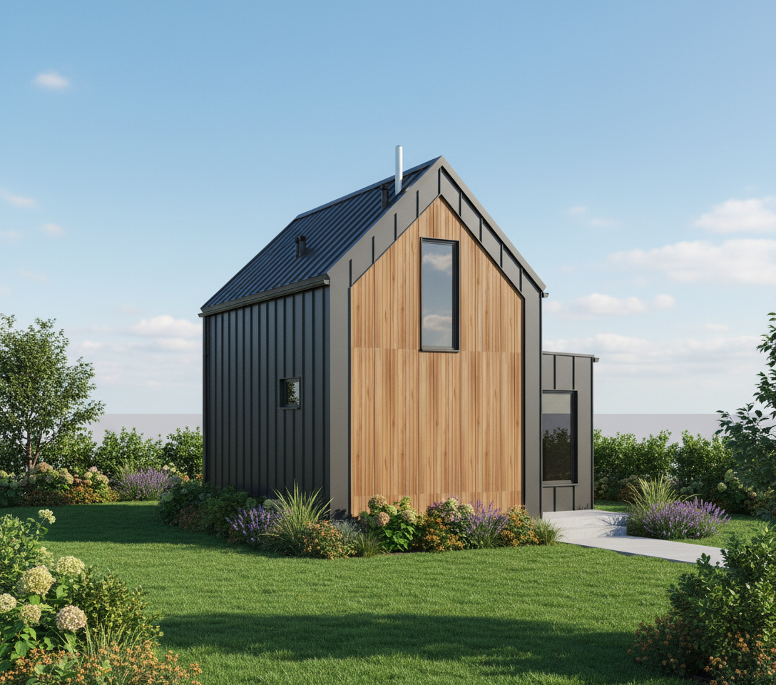 a manicured lawn layered flower beds low maintenance shrubs native plants concrete pathway beside big window dark metal roof realistic dark metal walls and natural wood do it natural and realistic