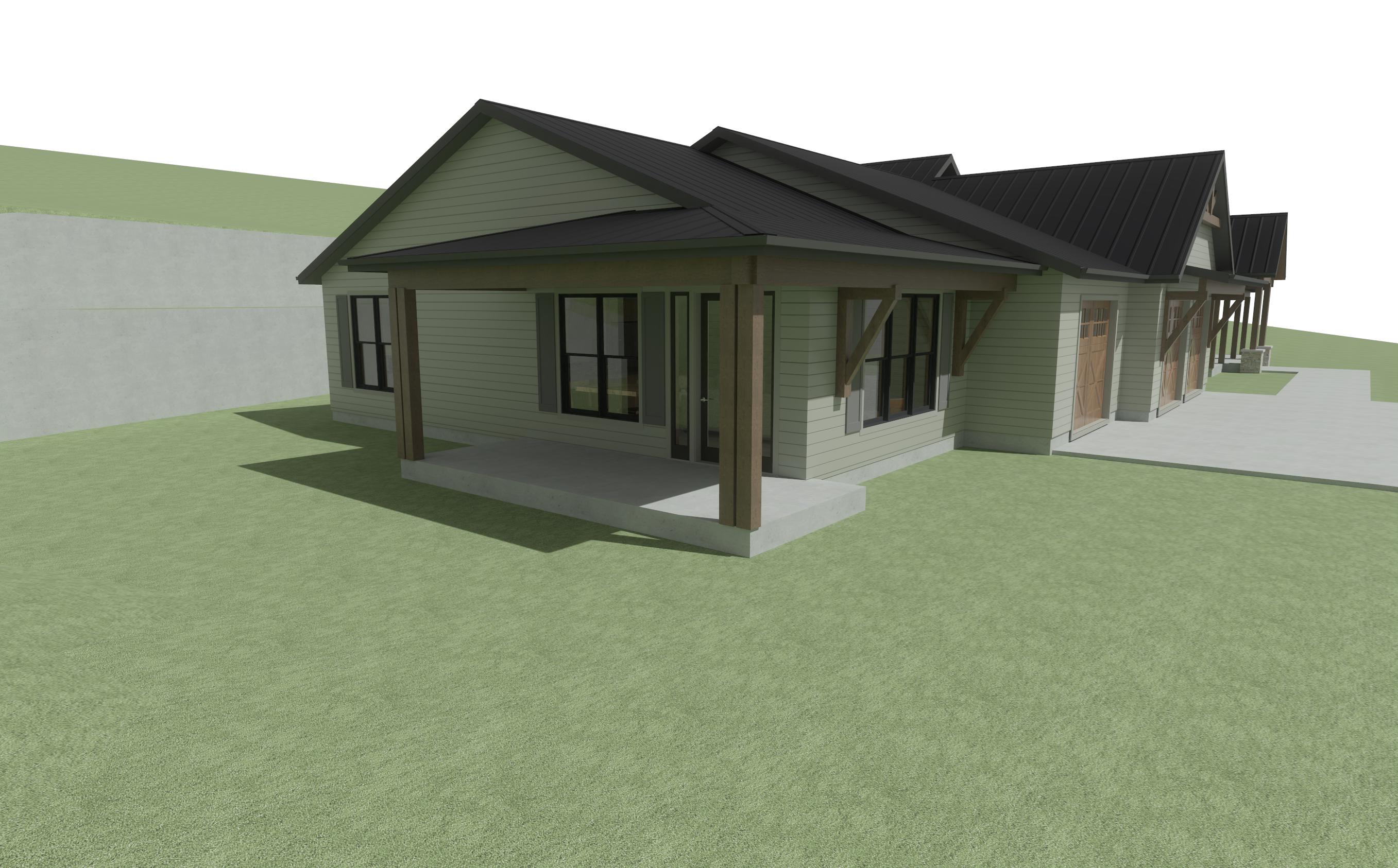 enhance the realism of the existing architectural design while maintaining the same materials and textures focus on realistic lighting shadows and surface details to create a lifelike appearance ensure the siding is preserved in the correct areas making them look authentic and cohesive this is in montana add montana in the woods landscape with nice landscaping near the house add montana vegetation around the house the hill is steep in front and behind this is a new house so make everything look fresh and new this is to help sell the design to the customer