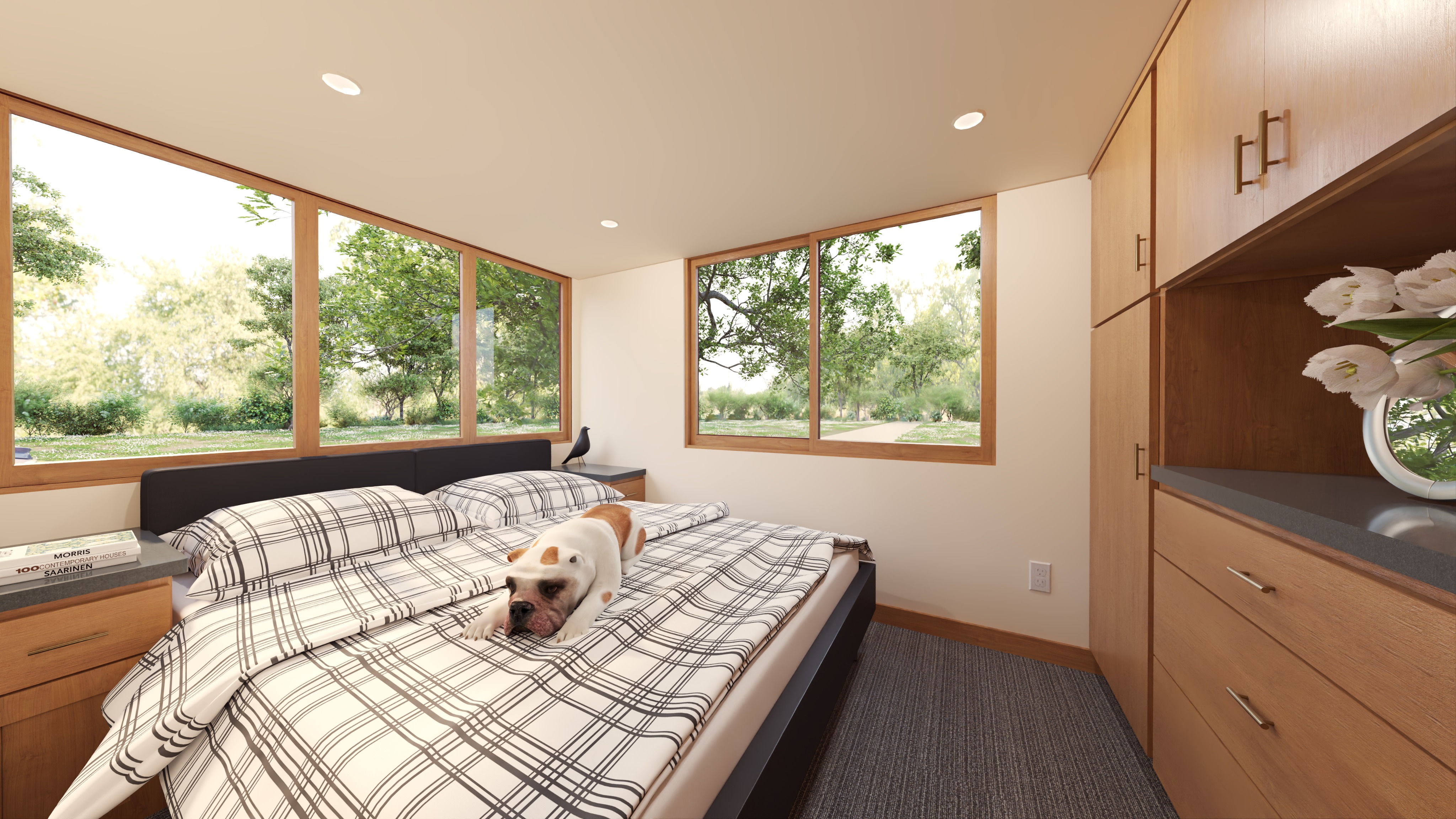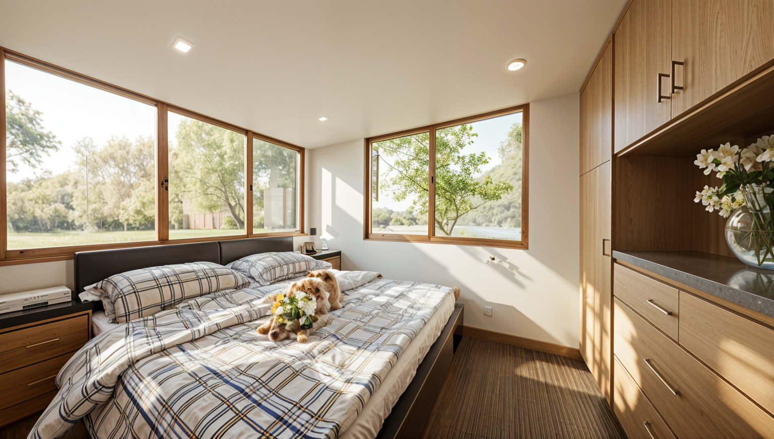 photorealistic interior architectural photography warm natural daylight under cabinet lighting and illuminated can lights in the ceiling soft directional light with realistic shadow falloff and gentle contrast bright but warm atmosphere realistic global illumination with subtle ambient occlusion in corners and at material transitions dslr with a 35mm lens eye level perspective professional architectural composition and framing and realistic depth slight depth of field foreground and midground in focus background softly flailing off physically based materials throughout with enhanced texture detail natural surface variation and subtle imperfections with realistic sheen high quality windows with realistic thickness subtle reflections of the interior soft exterior reflections and accurate light transmission windows feel transparent exterior visible through windows feels real and grounded with natural daylight realistic trees and landscape interacting with the light warm color temperature balanced with natural daylight soft highlights realistic shadows gentle contrast subtle camera noise natural exposure not overly sharp soften corners and edges professional photography style do not change the geometry of the image